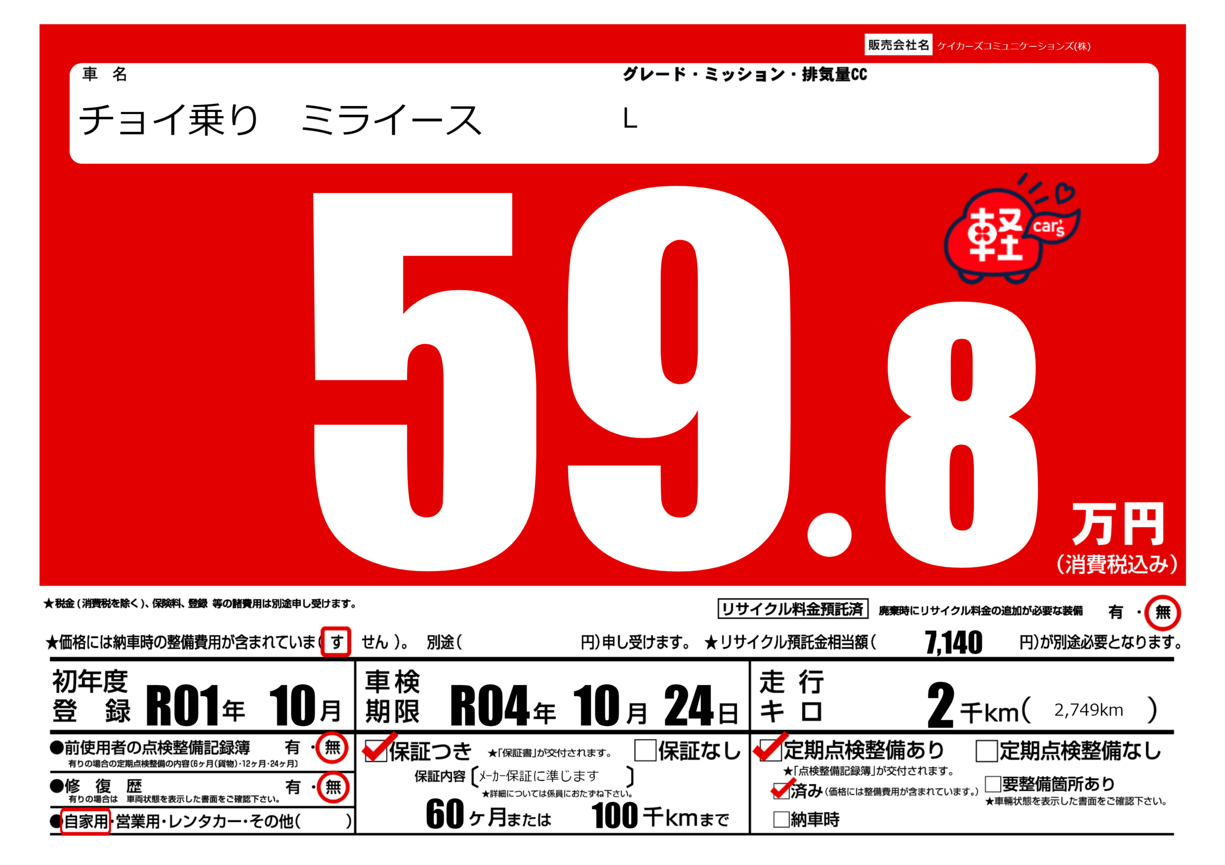| 定期点検整備 | 定期点検整備あり 定期点検整備済み | ||