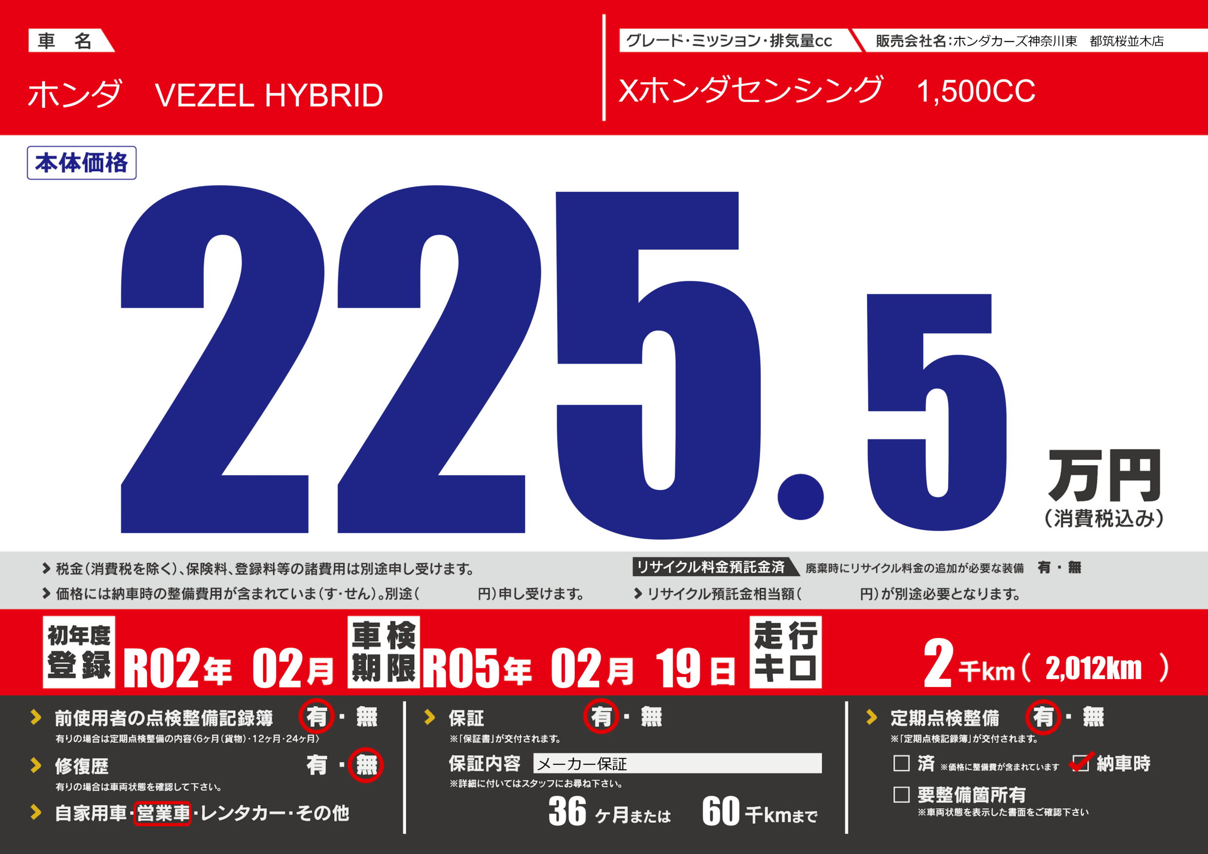 | 車名 | ホンダ VEZEL HYBRID | グレード ミッション 排気量 |