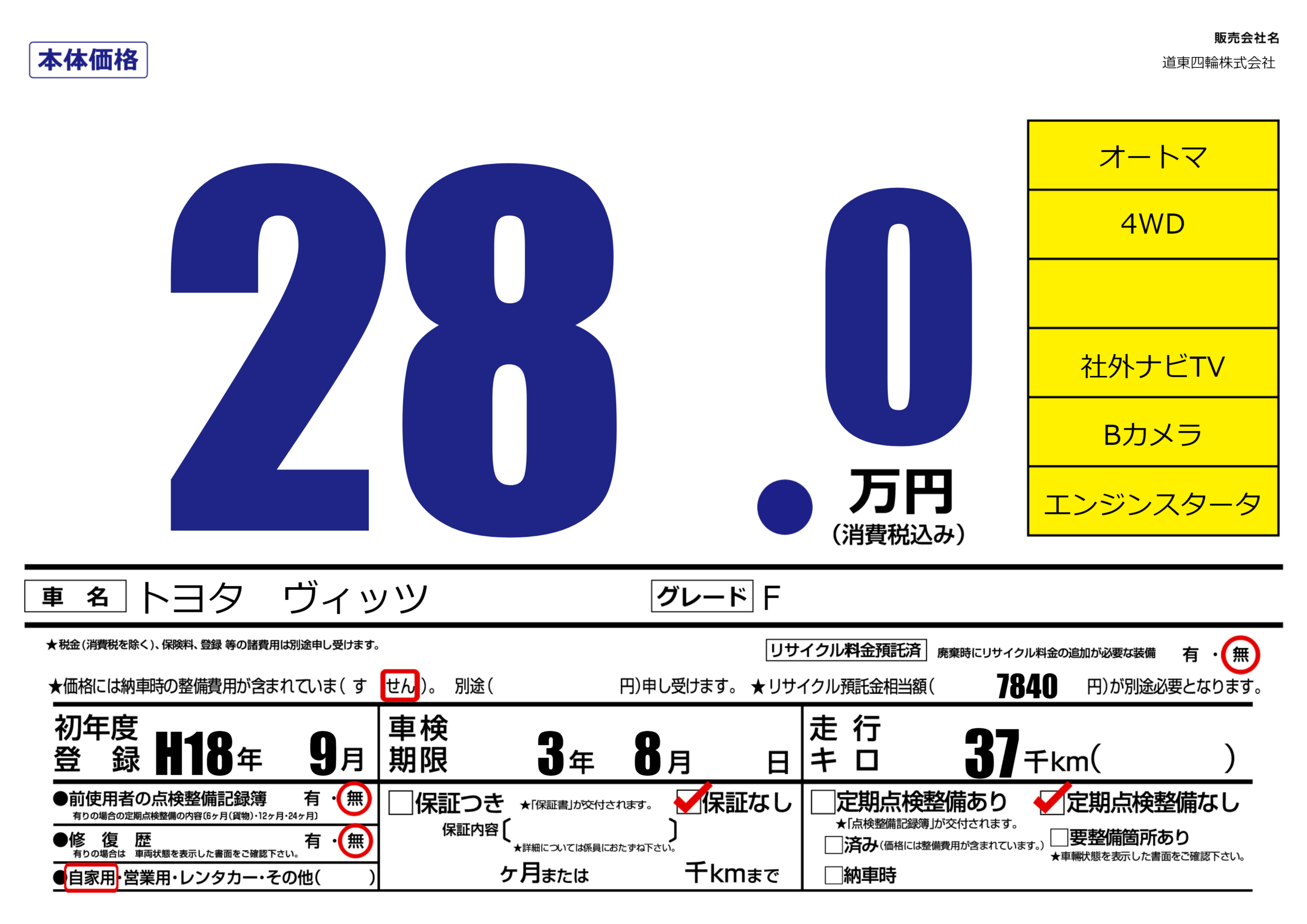 | 車名 | トヨタ ヴィッツ | グレード ミッション 排気量 |
