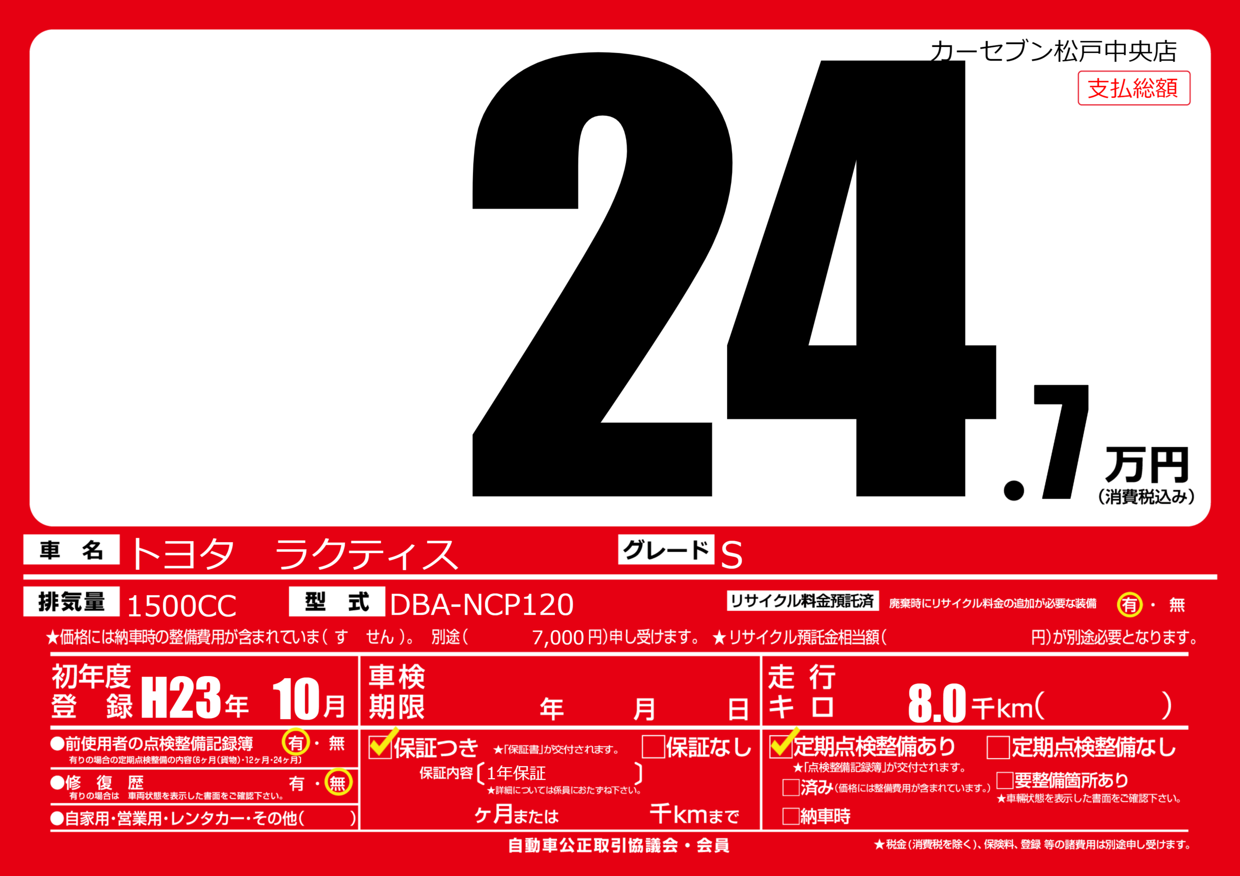 | 車名 | トヨタ ラクティス | グレード ミッション 排気量 |