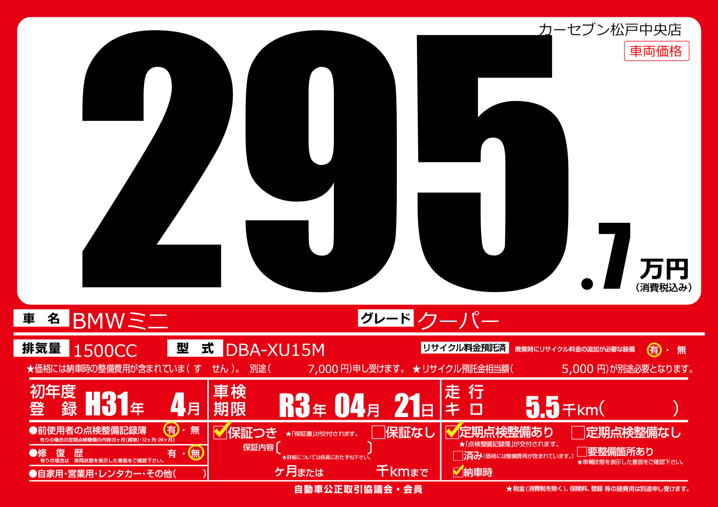 | 走行キロ | 0.5万km | 初年度登録 | H31年4月 |