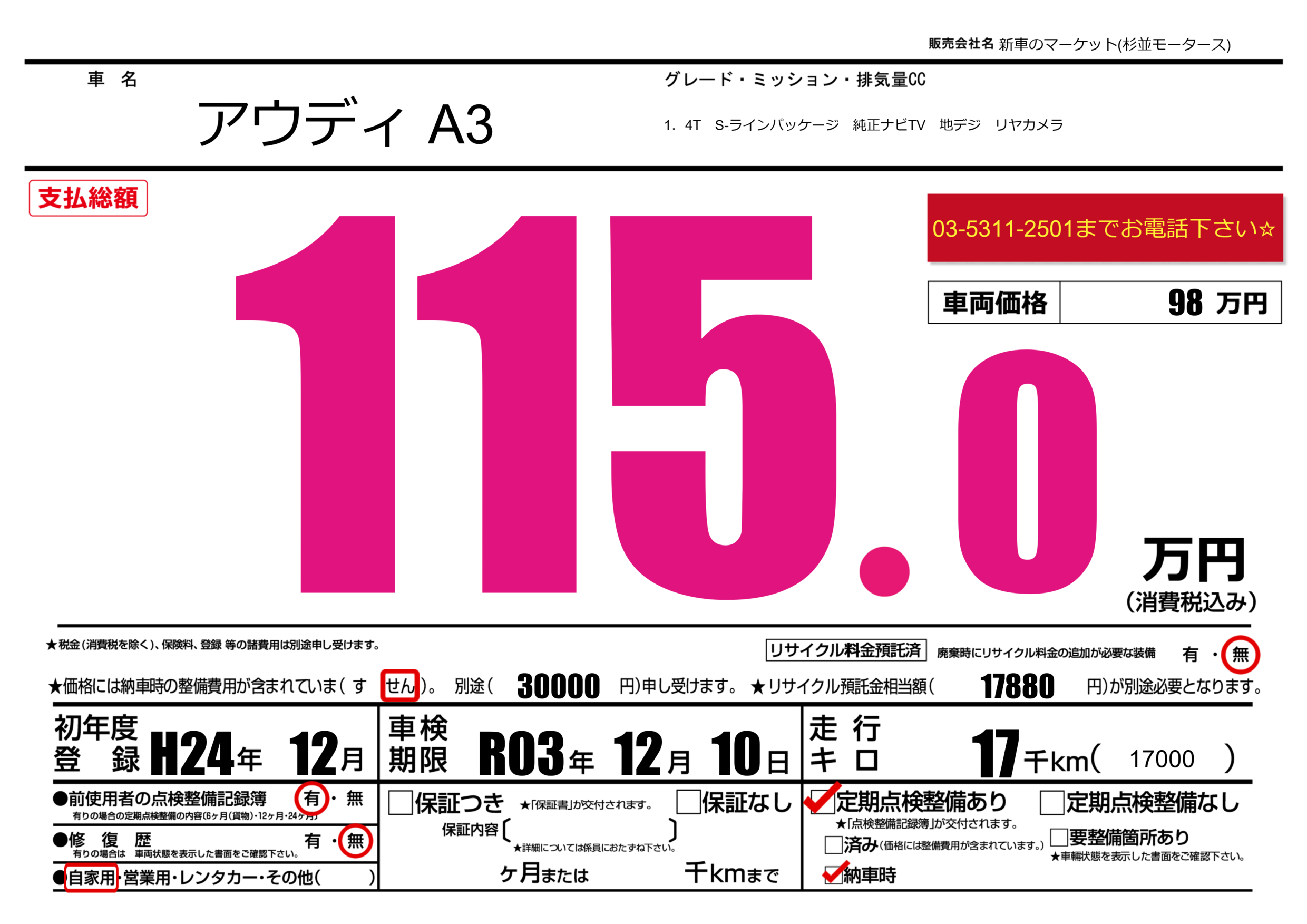 | 車名 | アウディ A3 | グレード ミッション 排気量 |