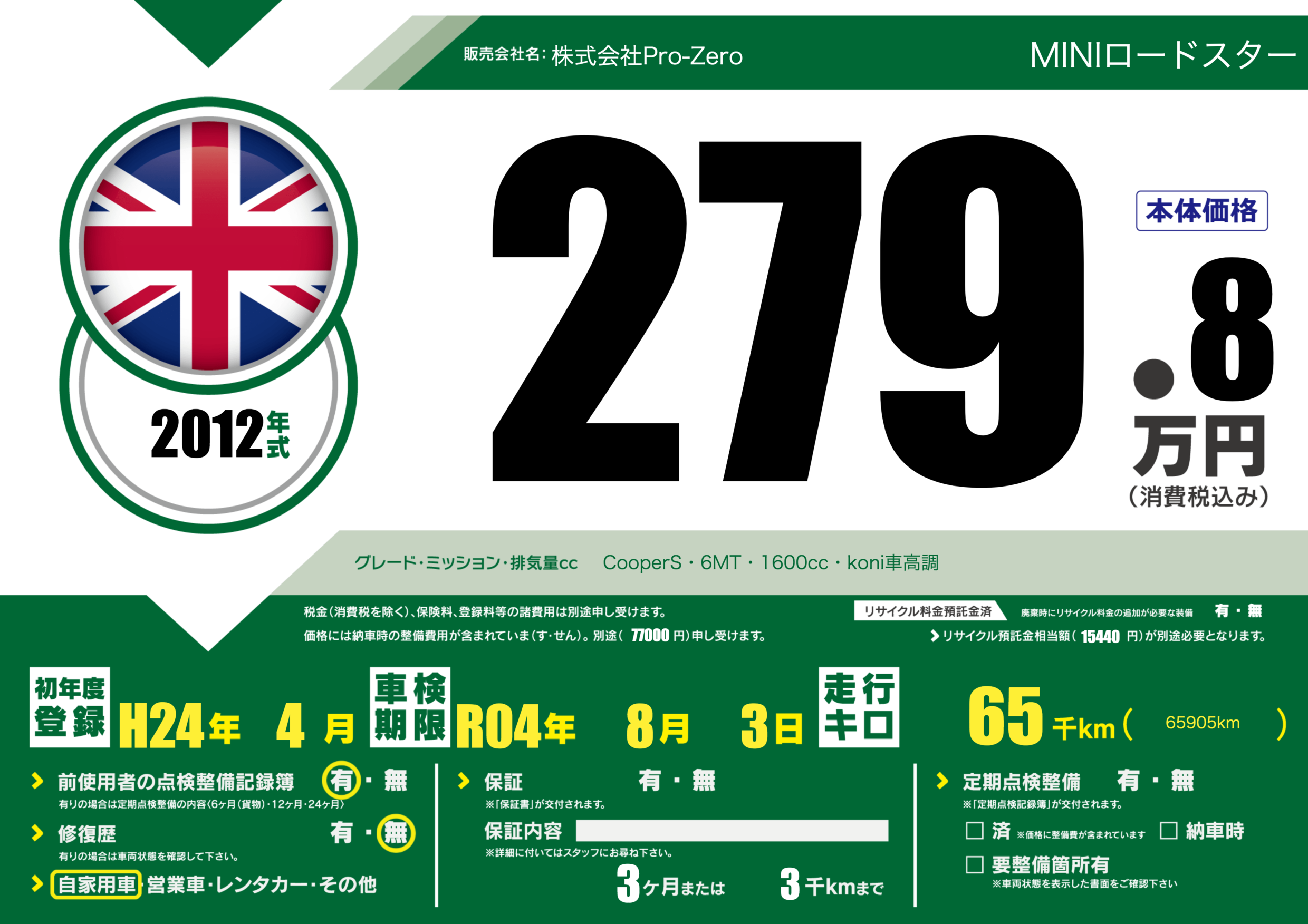 | 車名 | MINIロードスター | グレード ミッション 排気量 |
