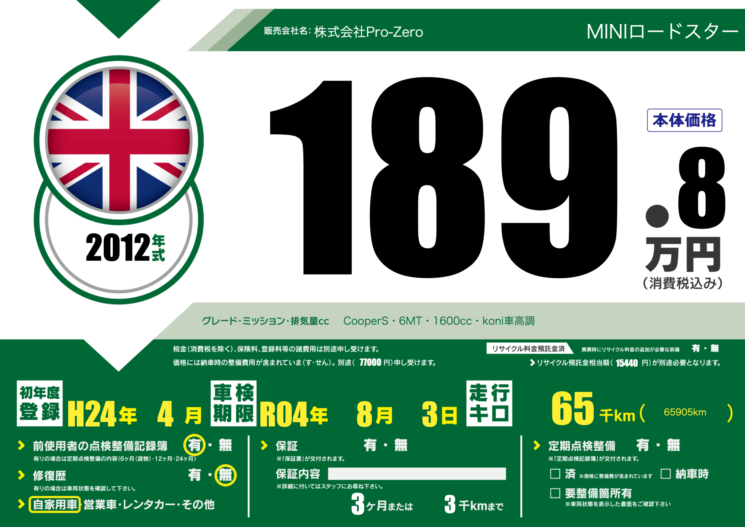 | 車名 | MINIロードスター | グレード ミッション 排気量 |