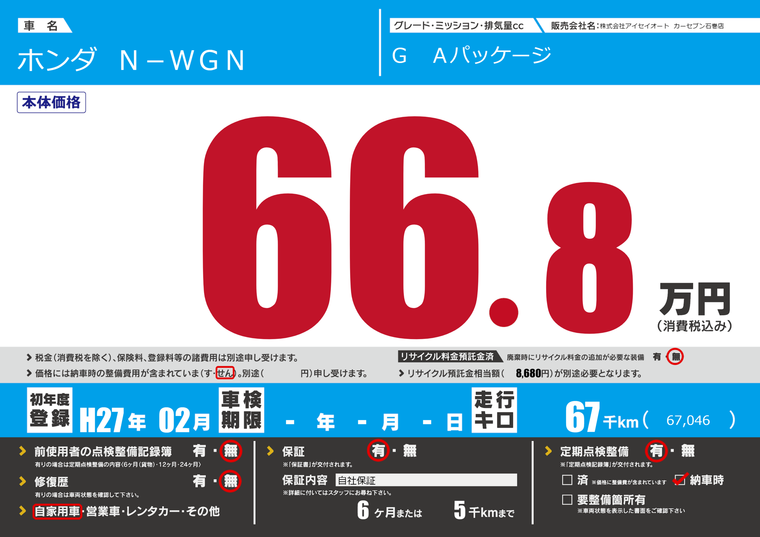 保証付き 保証内容(自社保証) 6ヶ月または(5)千kmまで |
