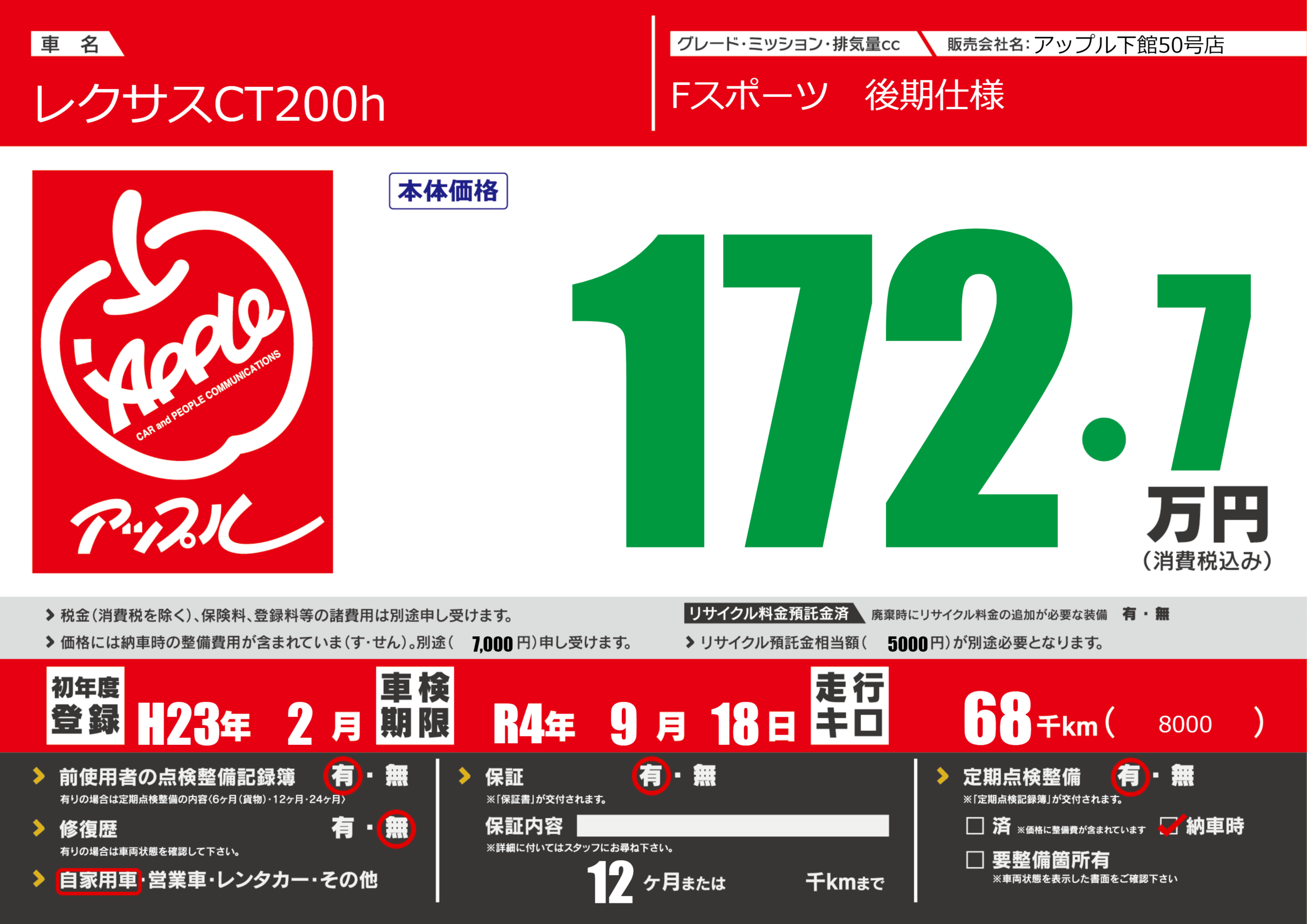 | 車名 | レクサスCT200h | グレード ミッション 排気量 |
