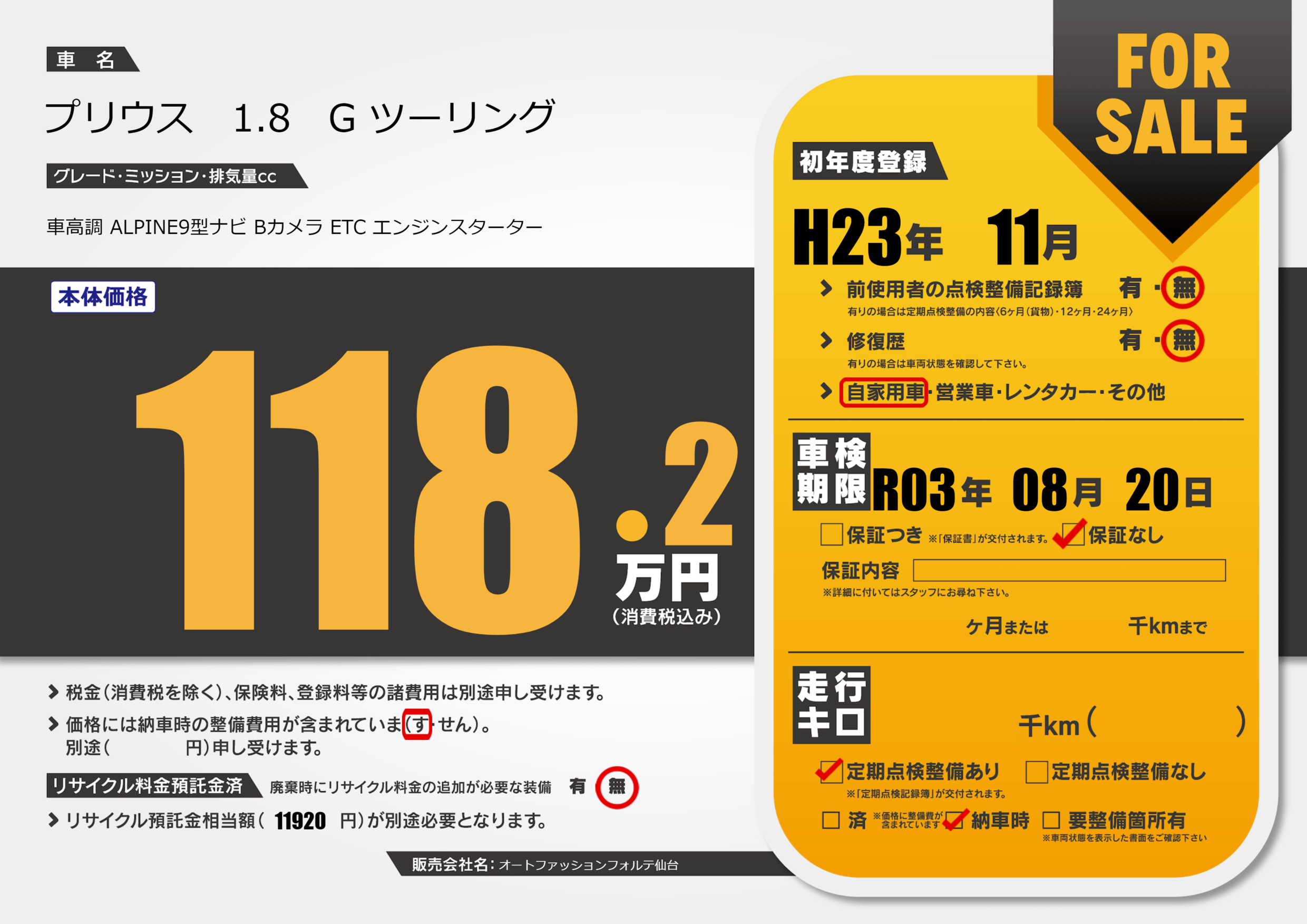 | 車名 | プリウス 1.8 G ツーリング | グレード ミッション 排気量 |