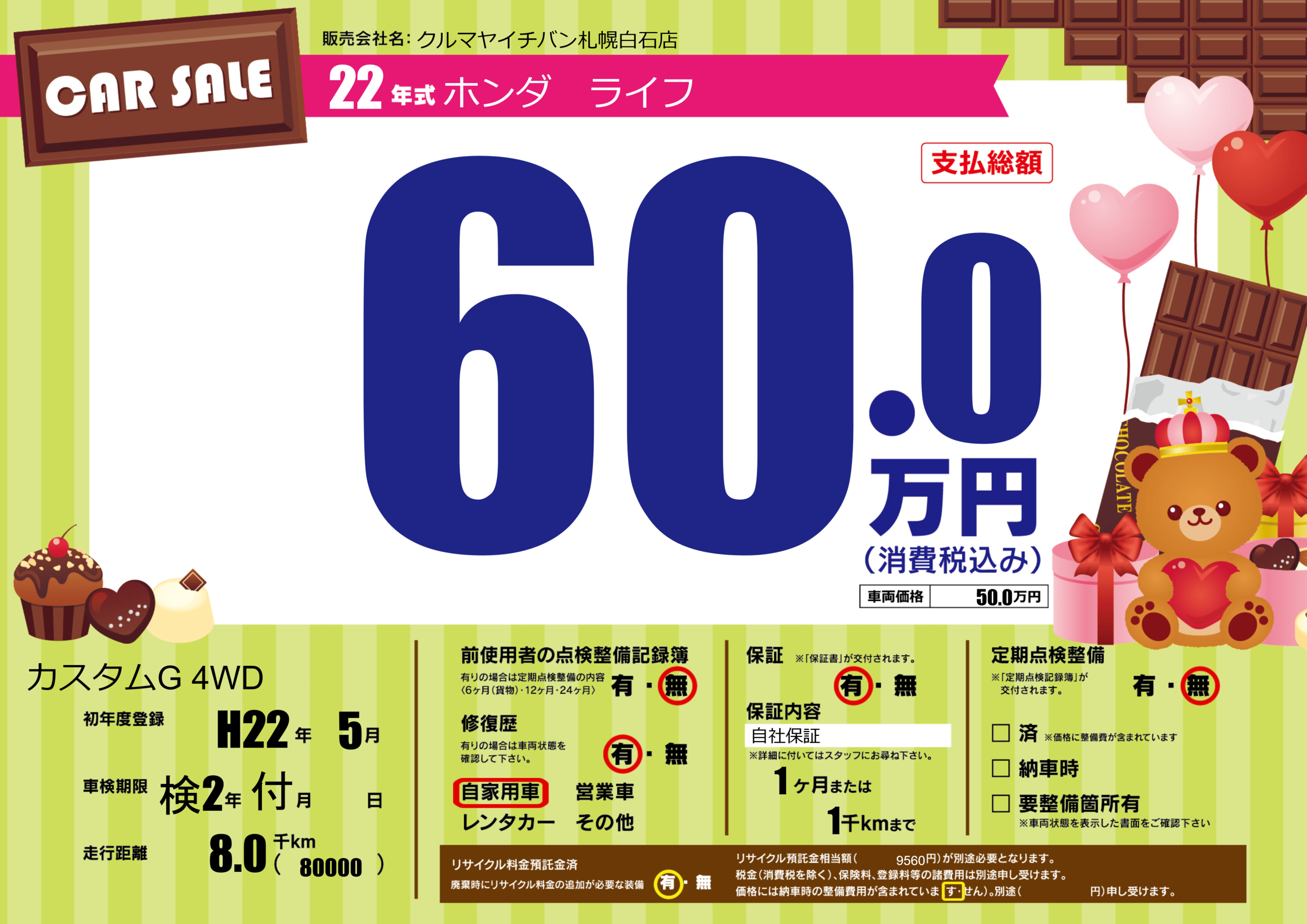 | 走行キロ | 0.8万km | 初年度登録 | H22年5月 |