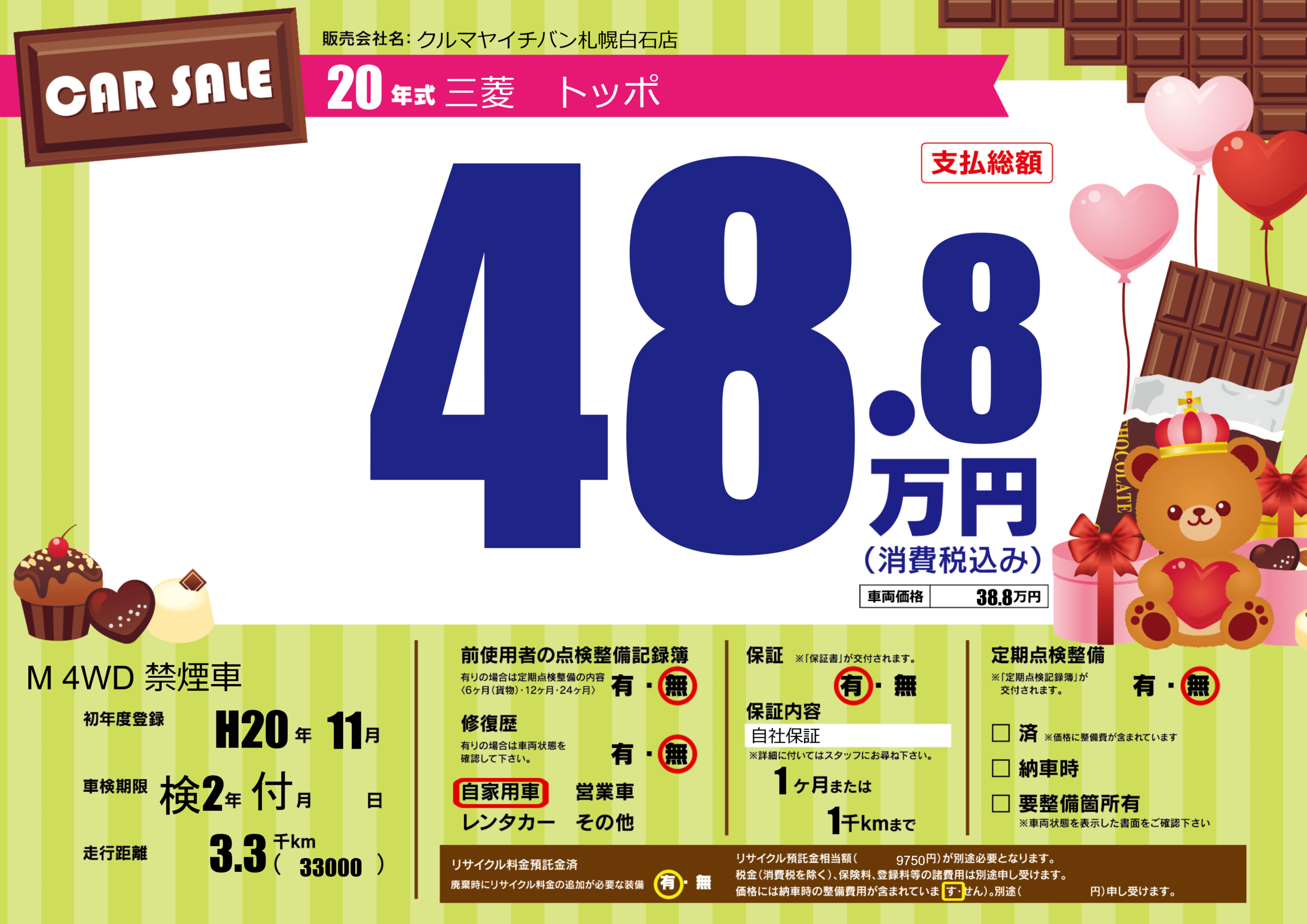 | 走行キロ | 0.3万km | 初年度登録 | H20年11月 |