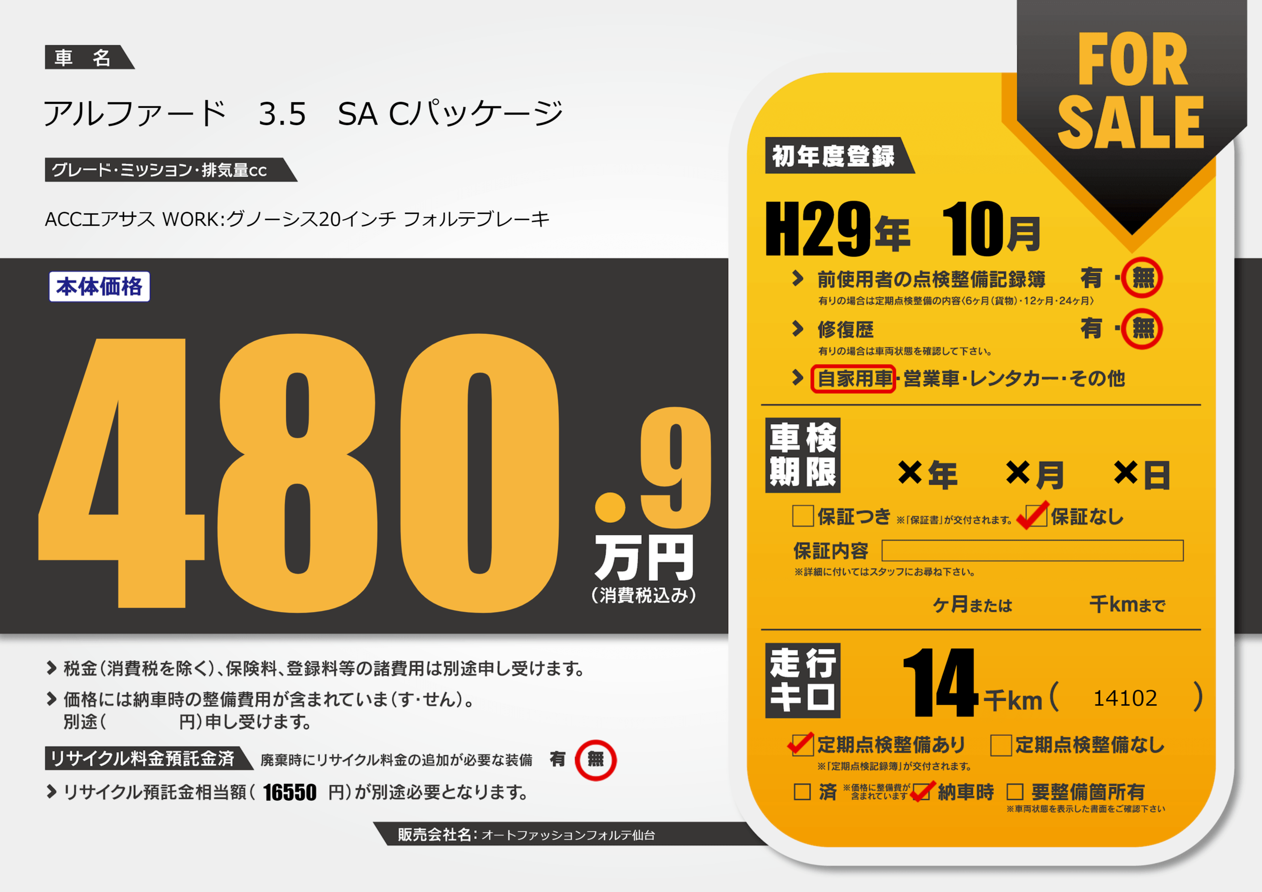 | 車名 | アルファード 3.5 SA Cパッケージ | グレード ミッション 排気量 |