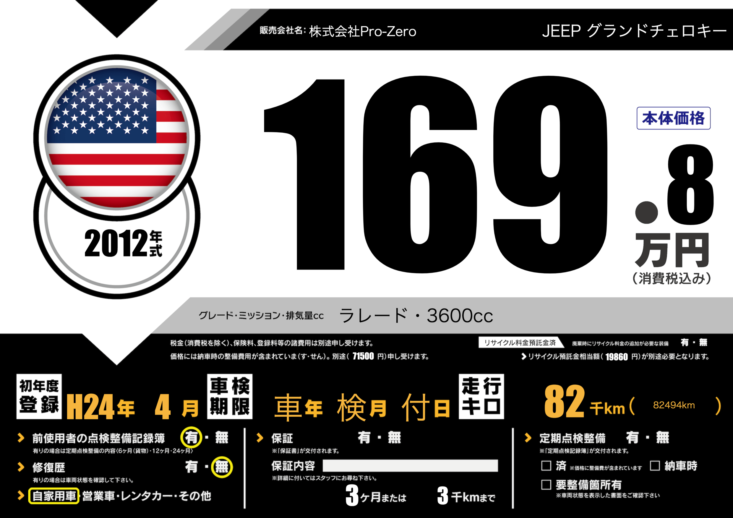| 車名 | JEEP グランドチェロキー | グレード ミッション 排気量 |