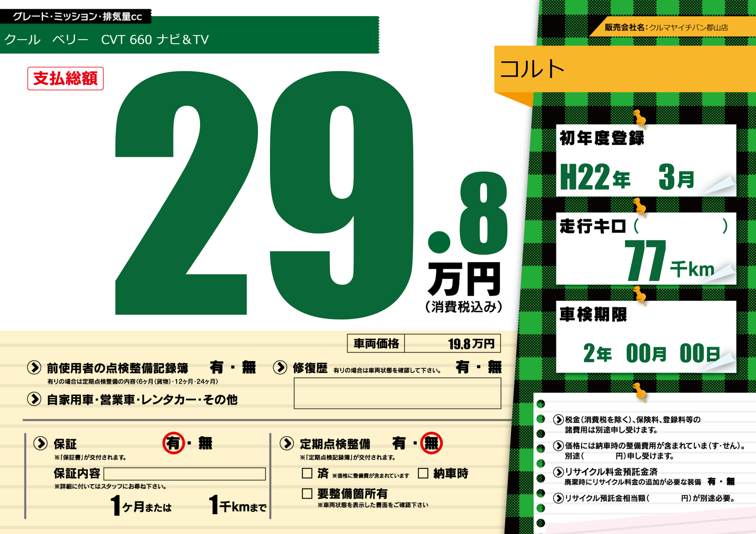 | 走行キロ | 7.7万km | 初年度登録 | H22年3月 |