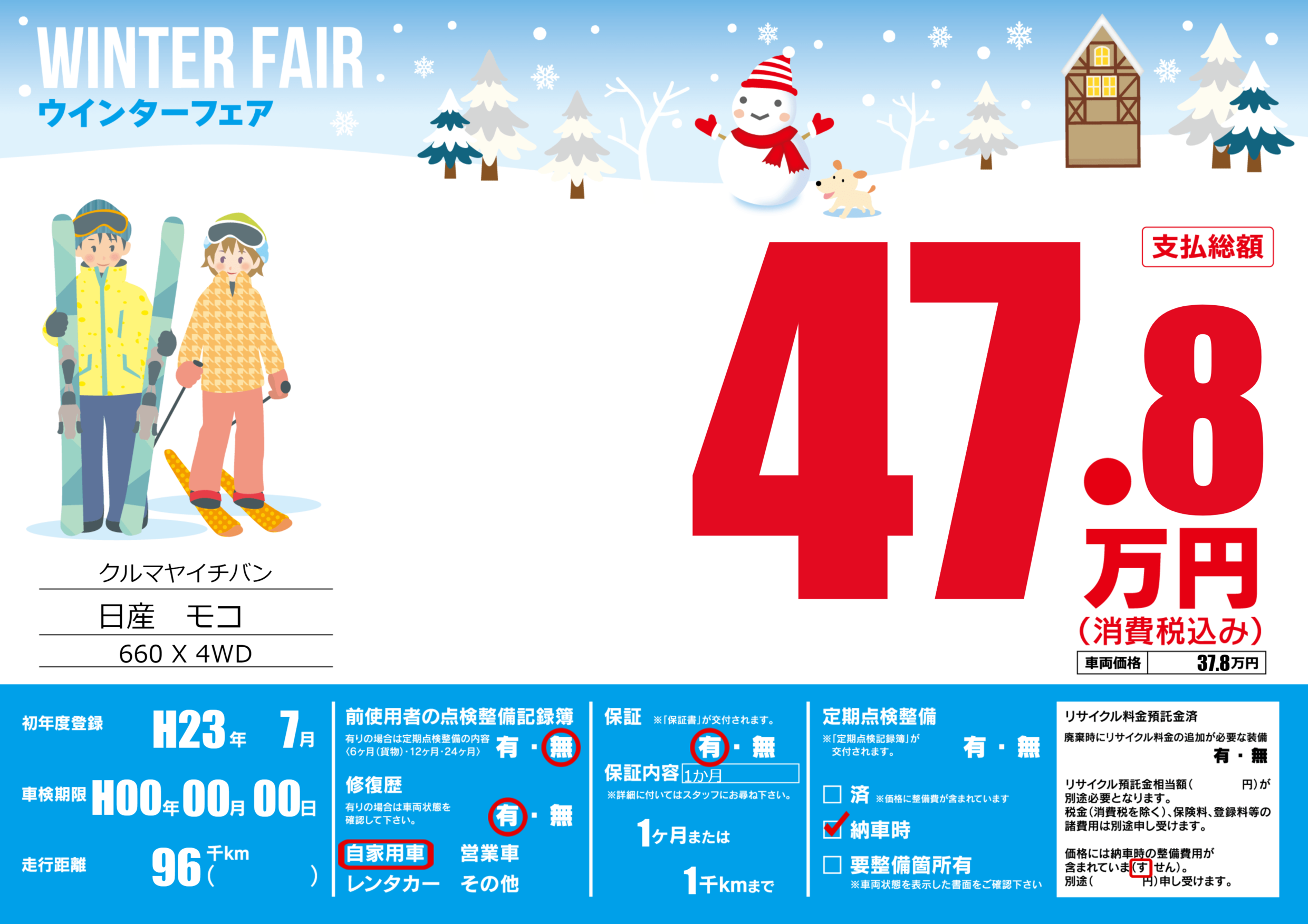 | 走行キロ | 9.6万km | 初年度登録 | H23年7月 |