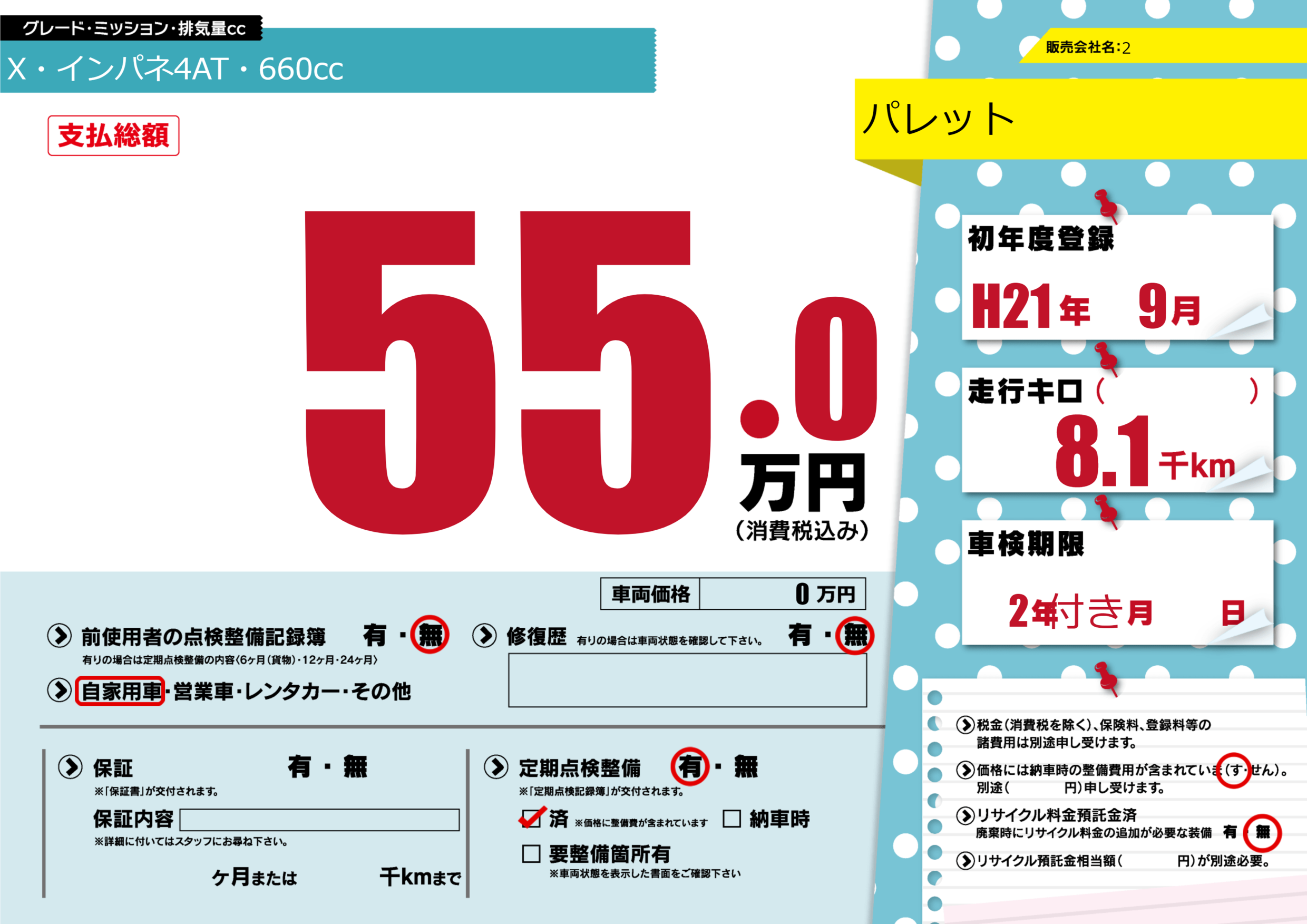 | 定期点検整備 | 定期点検整備あり 定期点検整備済み | ||