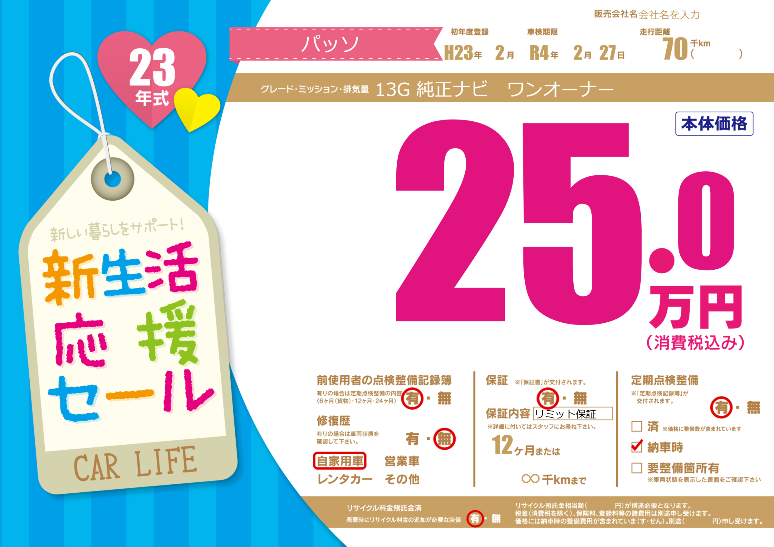 | 定期点検整備 | 定期点検整備あり 納車時あり | ||