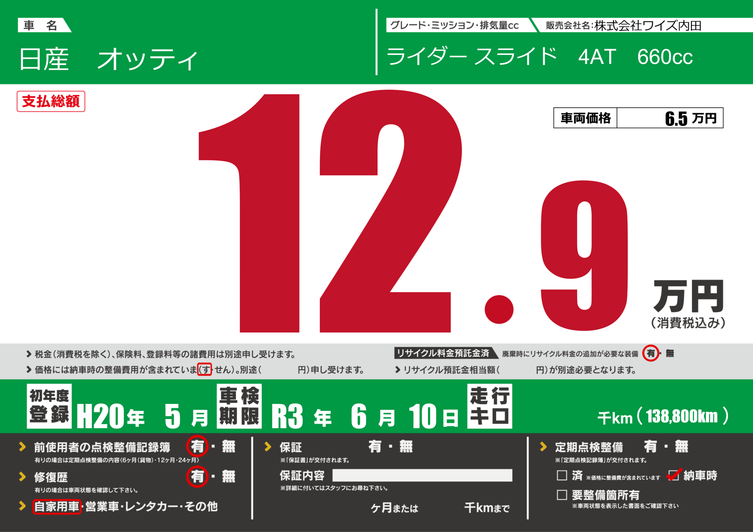 | 車名 | 日産 オッティ | グレード ミッション 排気量 |