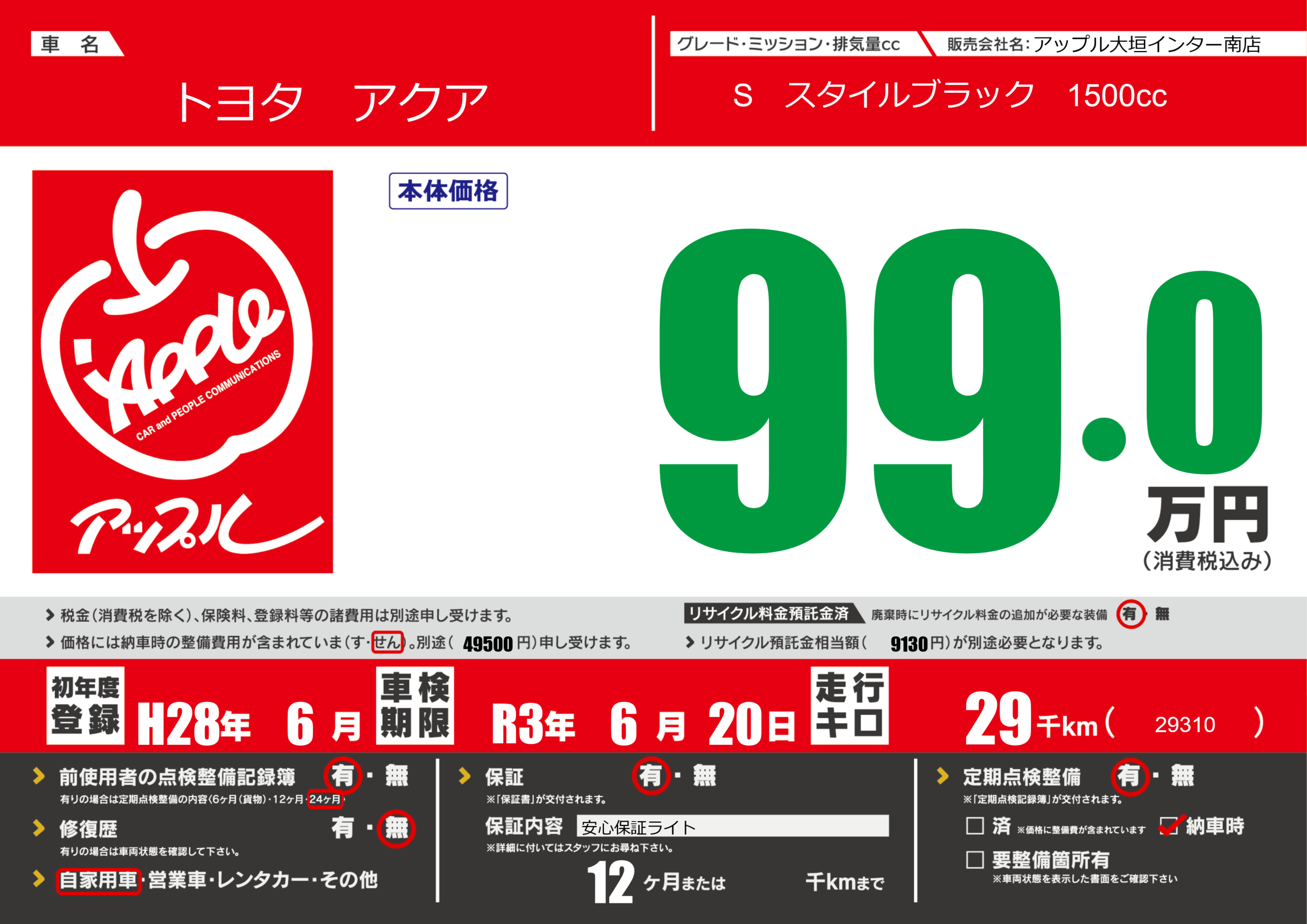 | 車名 | トヨタ アクア | グレード ミッション 排気量 |