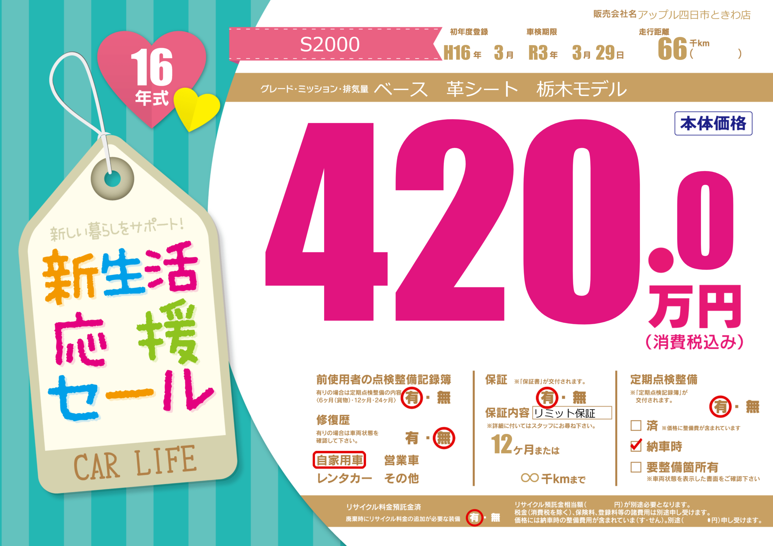 | 車名 | S2000 | グレード ミッション 排気量 |