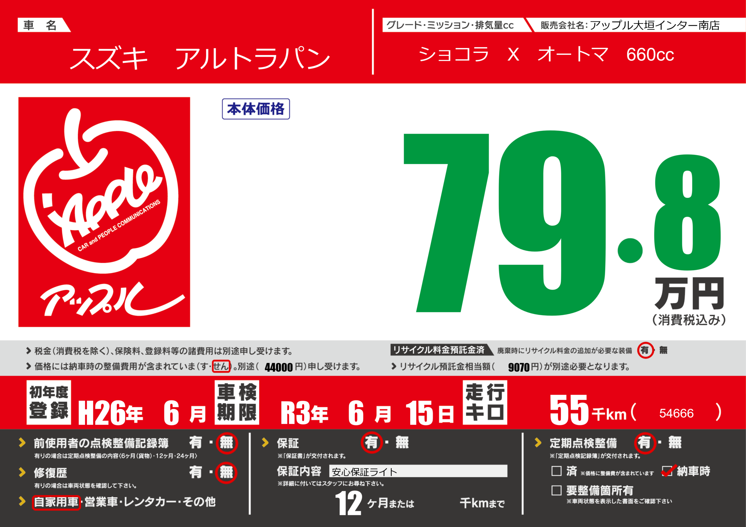 保証付き 保証内容(安心保証ライト) 12ヶ月または()千kmまで |