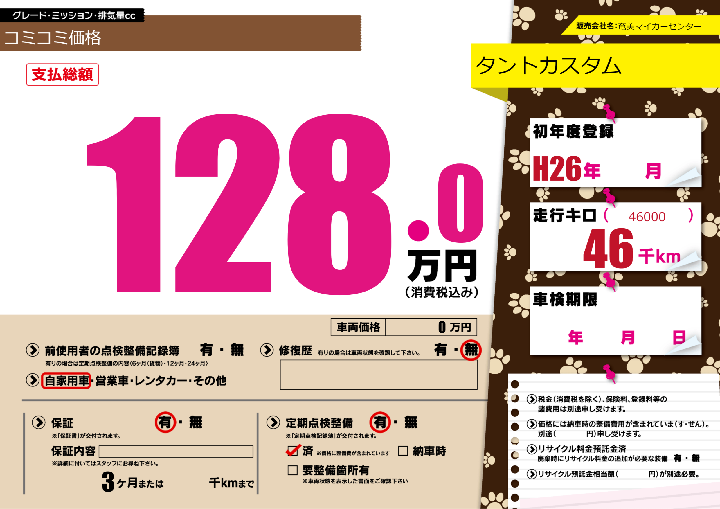 | 走行キロ | 4.6万km | 初年度登録 | H26年---月 |