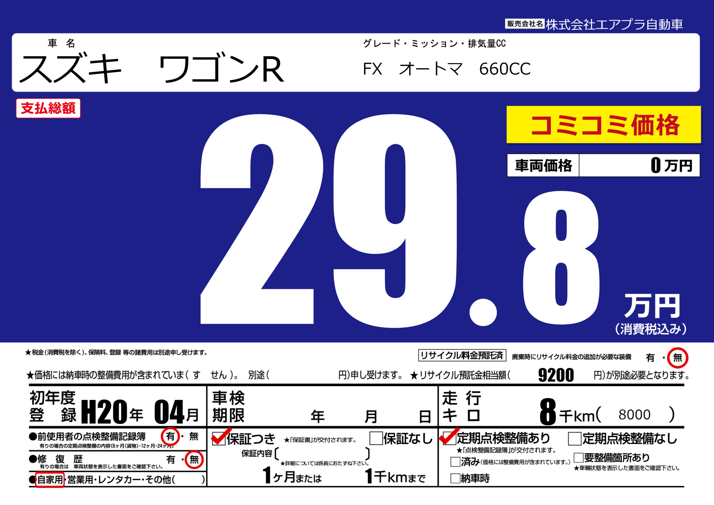 | 車名 | スズキ ワゴンR | グレード ミッション 排気量 |