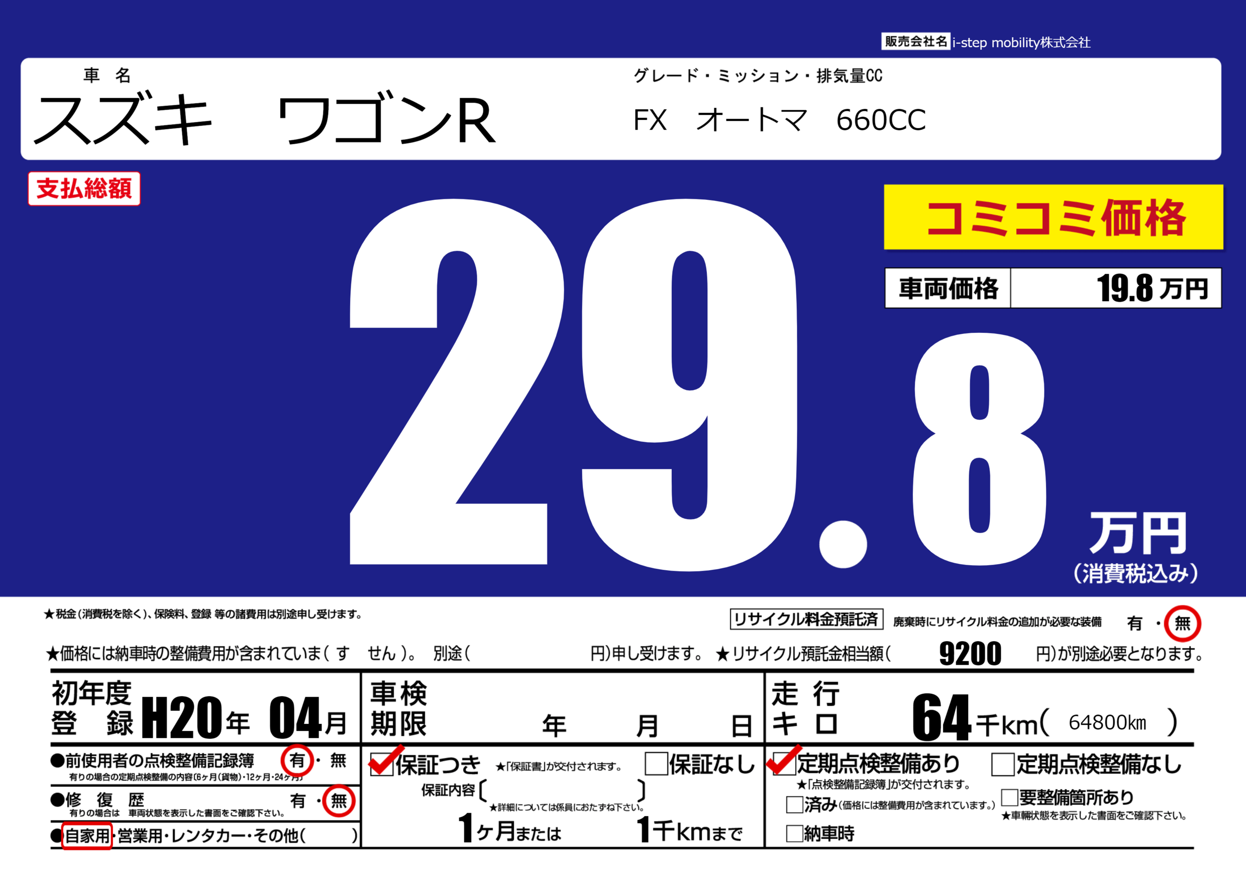 | 車名 | スズキ ワゴンR | グレード ミッション 排気量 |