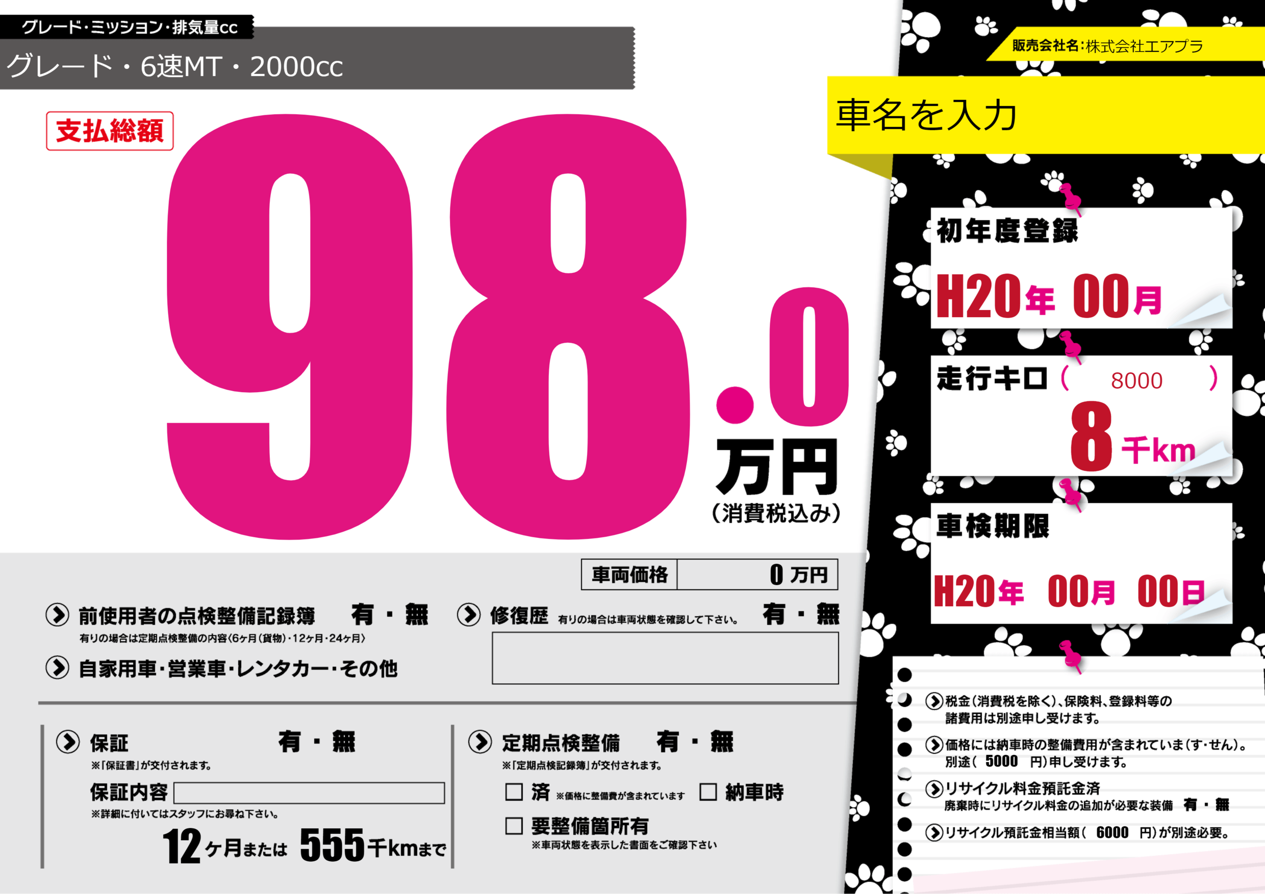 | 車名 | 車名を入力 | グレード ミッション 排気量 |