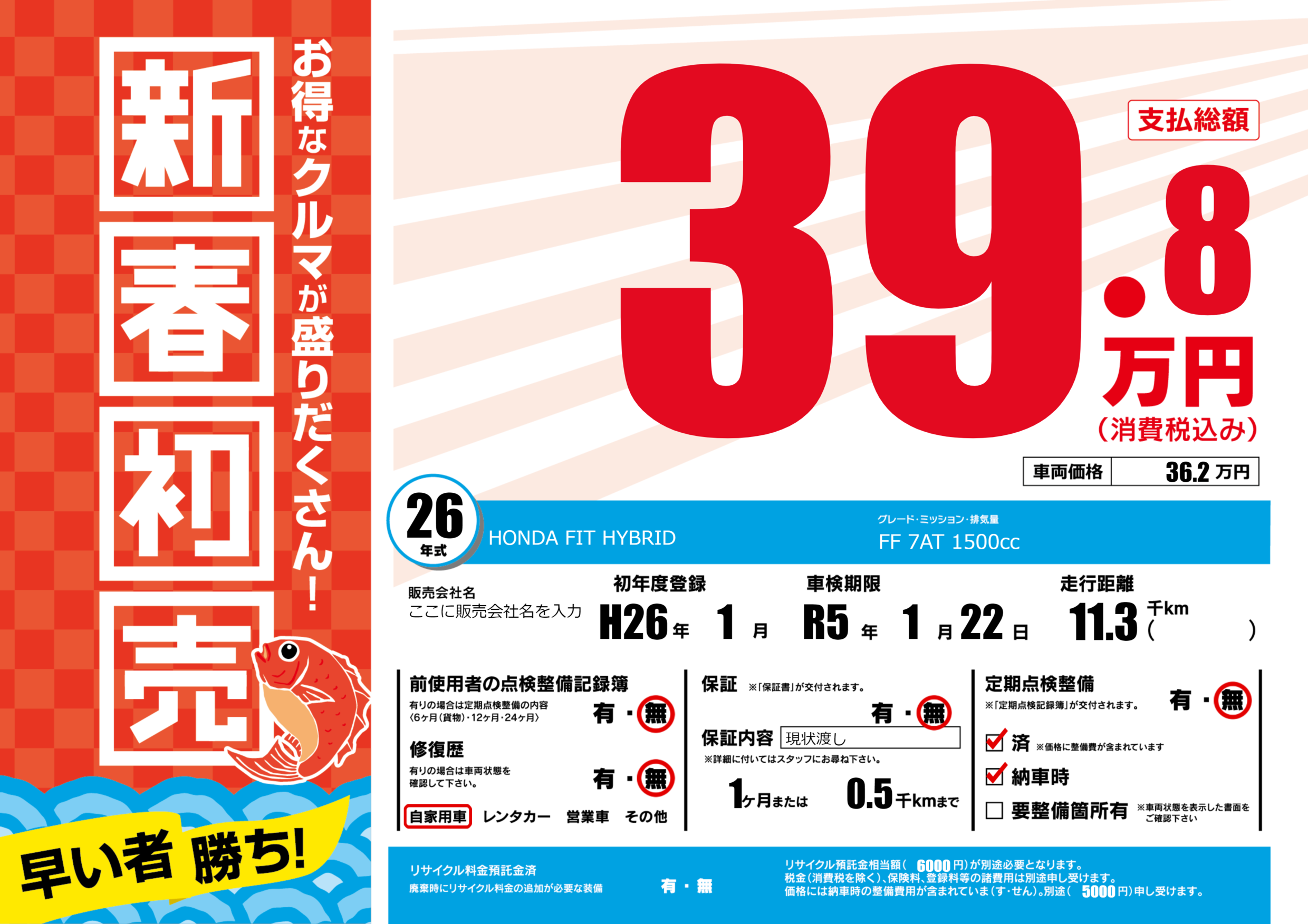 保証なし 保証内容(現状渡し) 1ヶ月または(0.5)千kmまで |