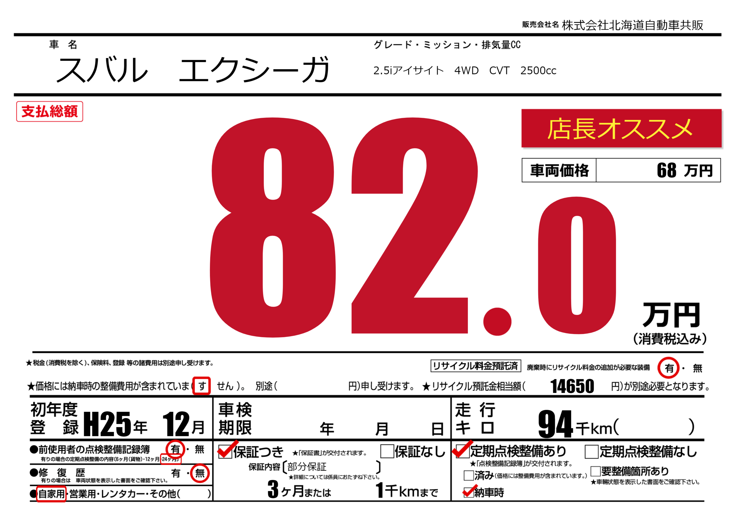 | 車名 | スバル エクシーガ | グレード ミッション 排気量 |