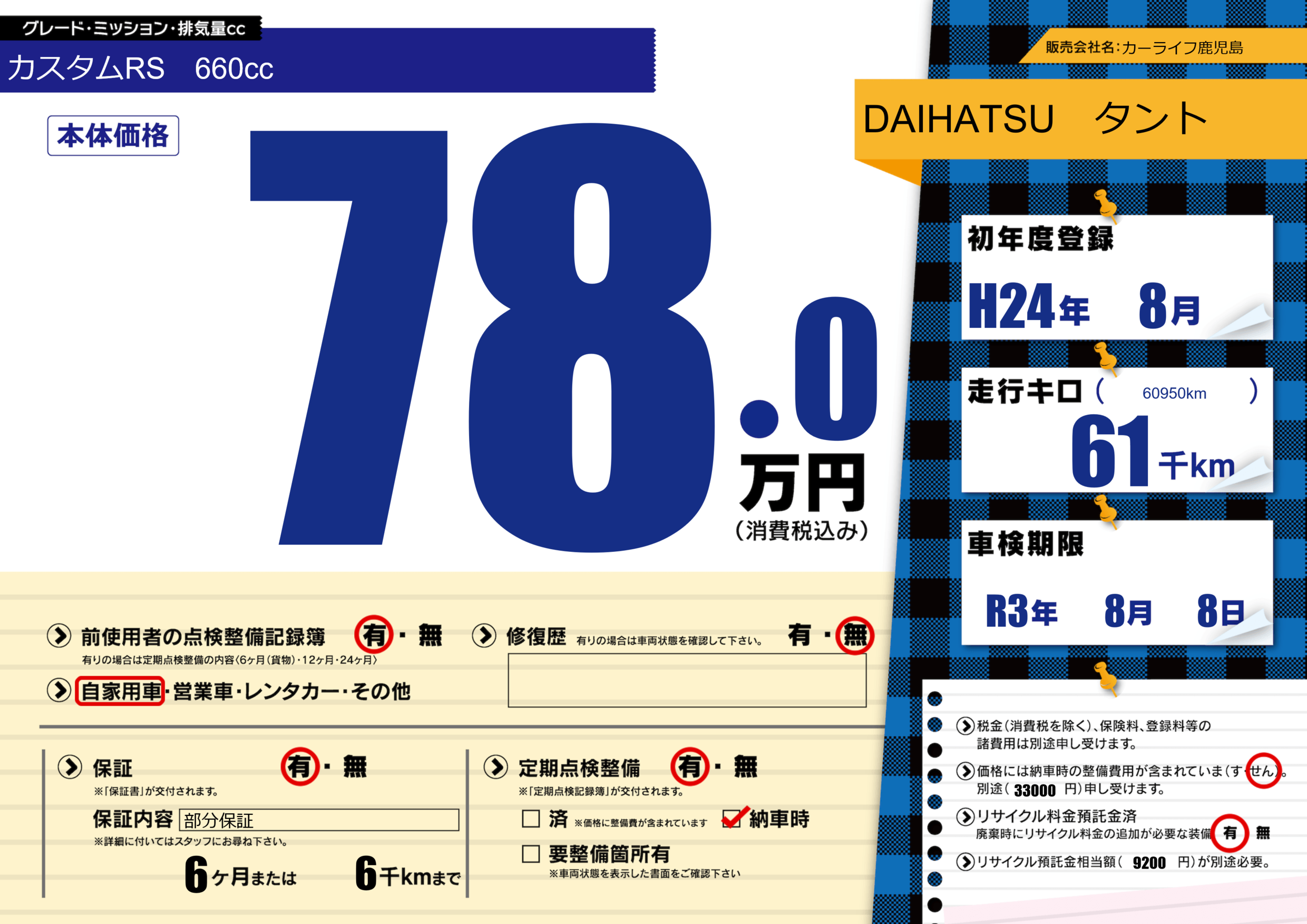 | 車名 | DAIHATSU タント | グレード ミッション 排気量 |
