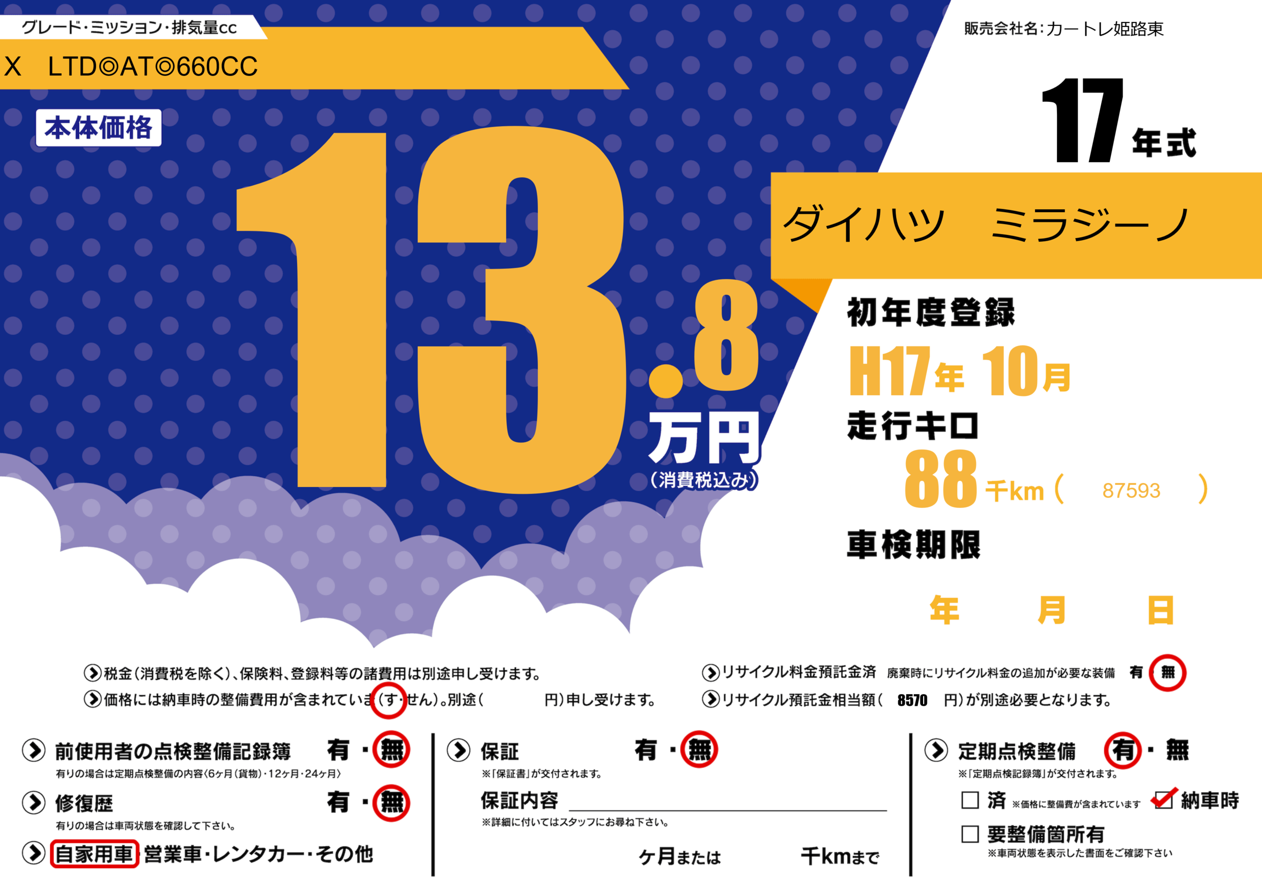 | 定期点検整備 | 定期点検整備あり 納車時あり | ||