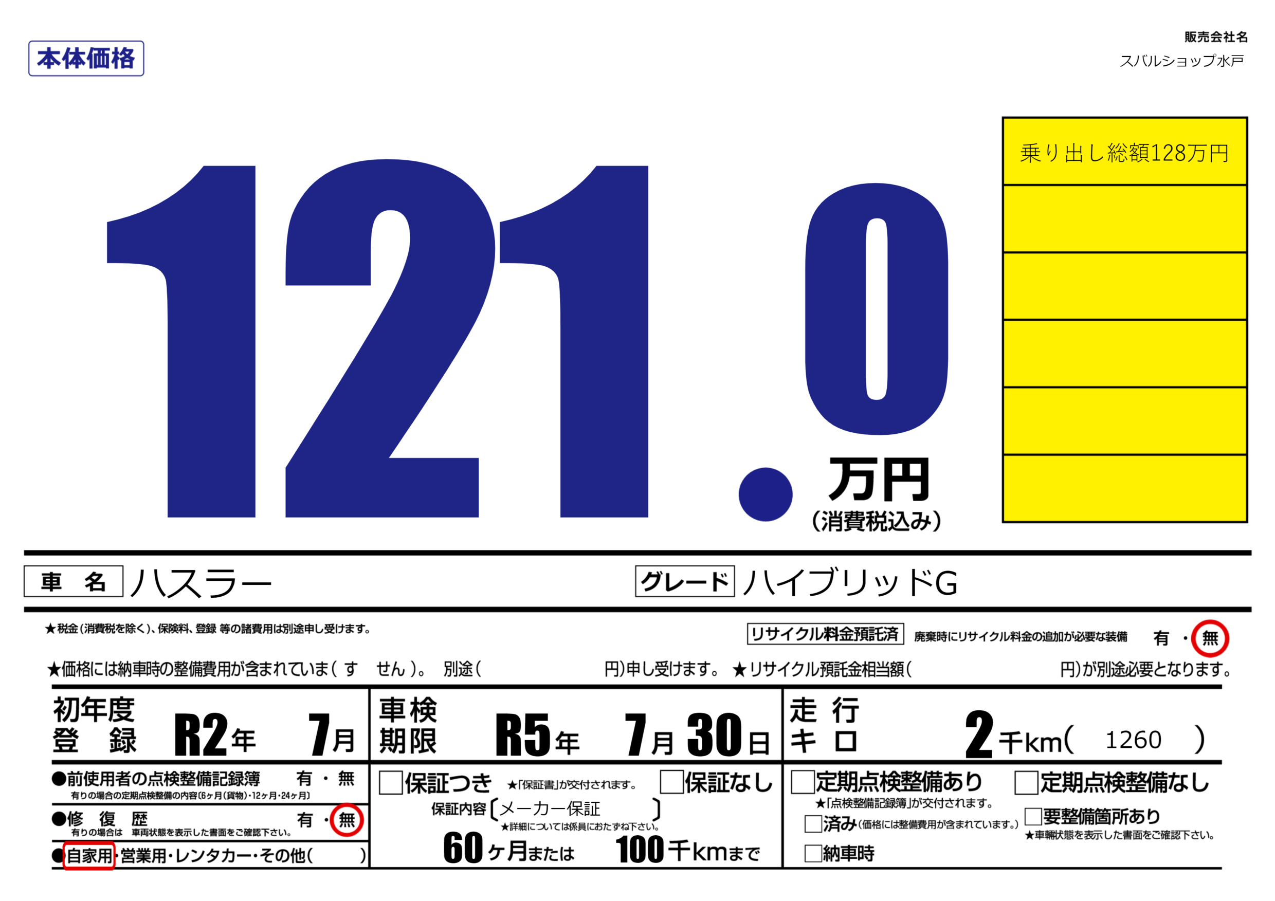 | 車名 | ハスラー | グレード ミッション 排気量 |