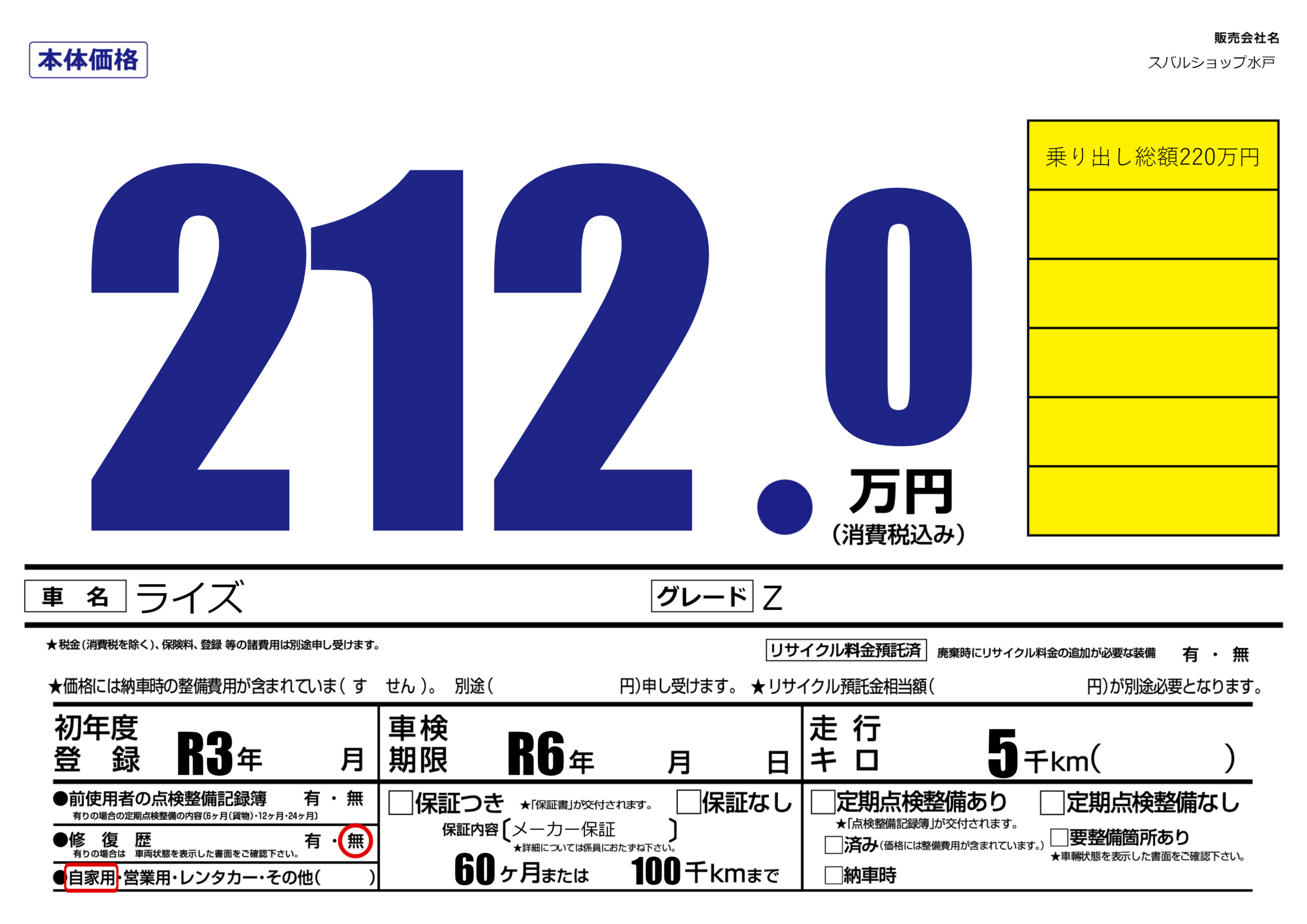 なし | 車検制限 | R6年---月---月 |