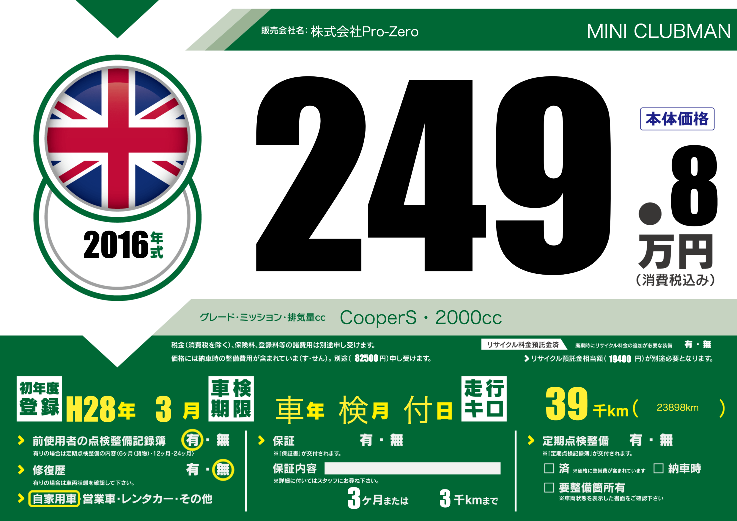 | 車名 | MINI CLUBMAN | グレード ミッション 排気量 |