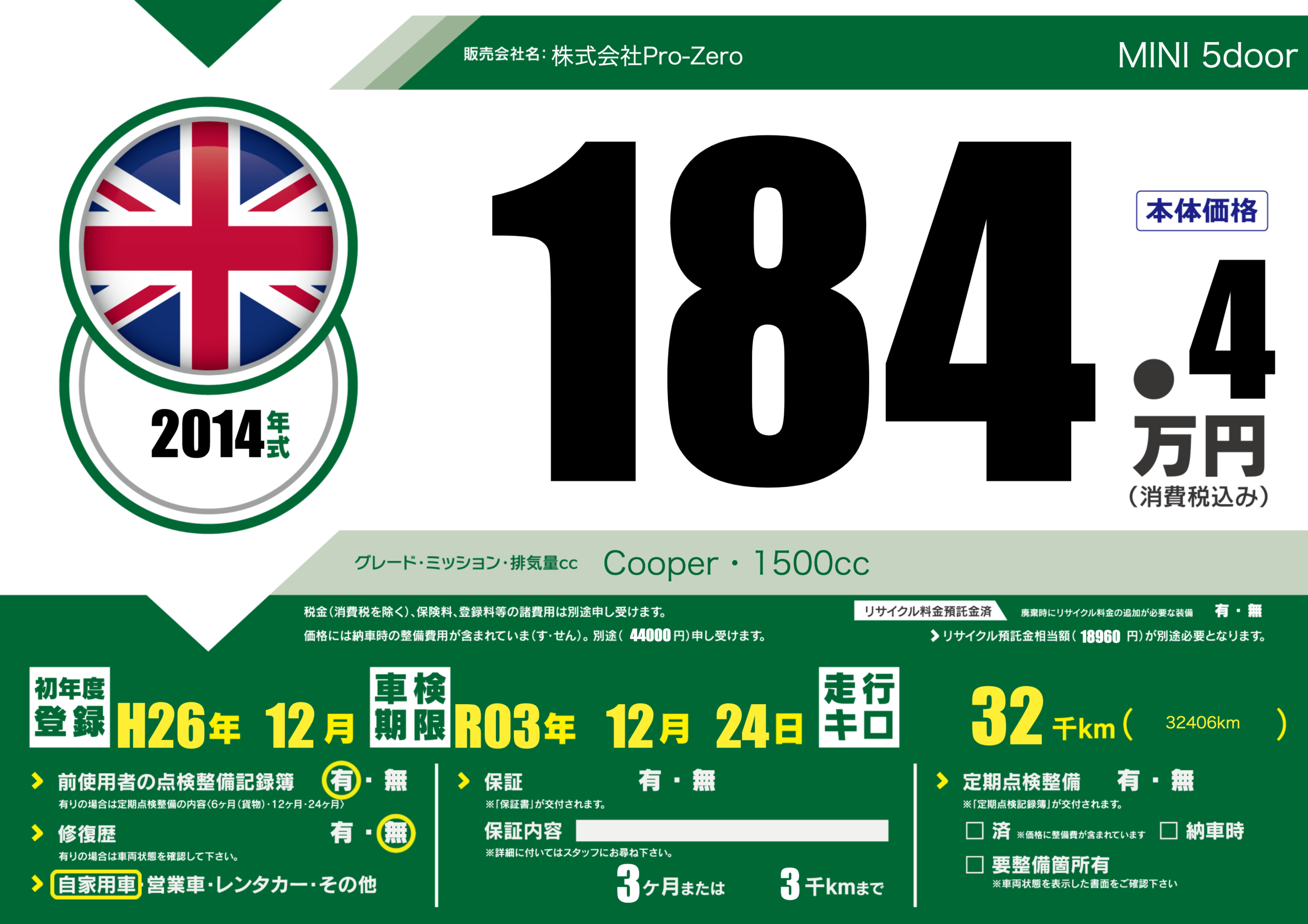 | 車名 | MINI 5door | グレード ミッション 排気量 |