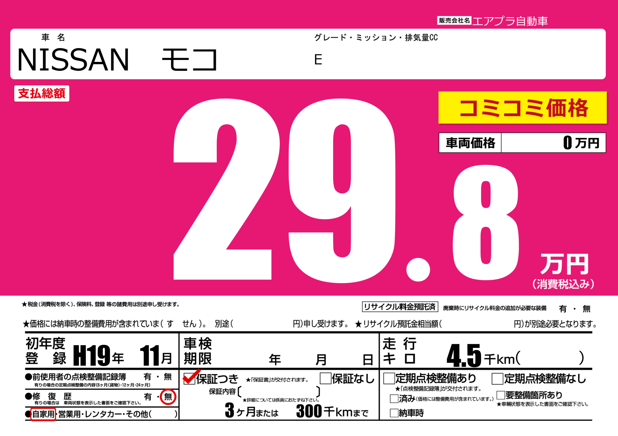 | 車名 | NISSAN モコ | グレード ミッション 排気量 |