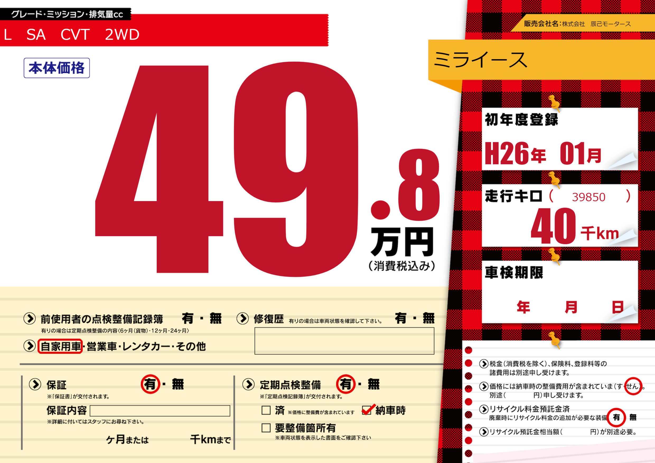 | 定期点検整備 | 定期点検整備あり 納車時あり | ||