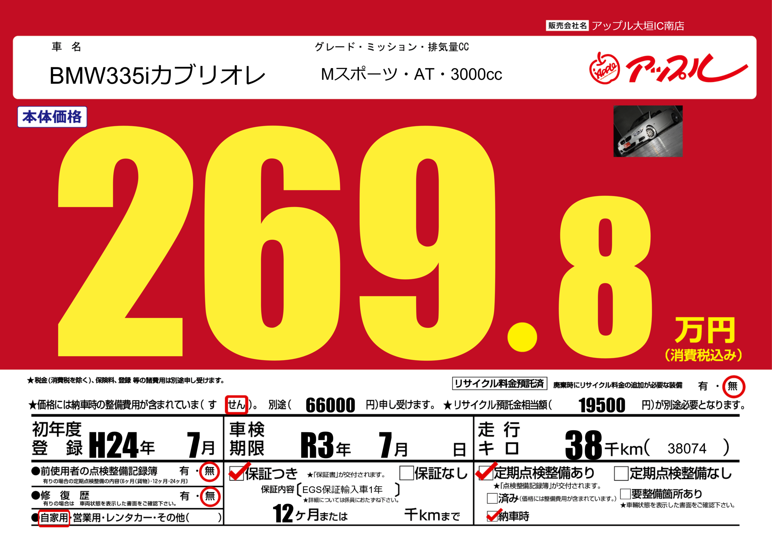 | 車名 | BMW335iカブリオレ | グレード ミッション 排気量 |