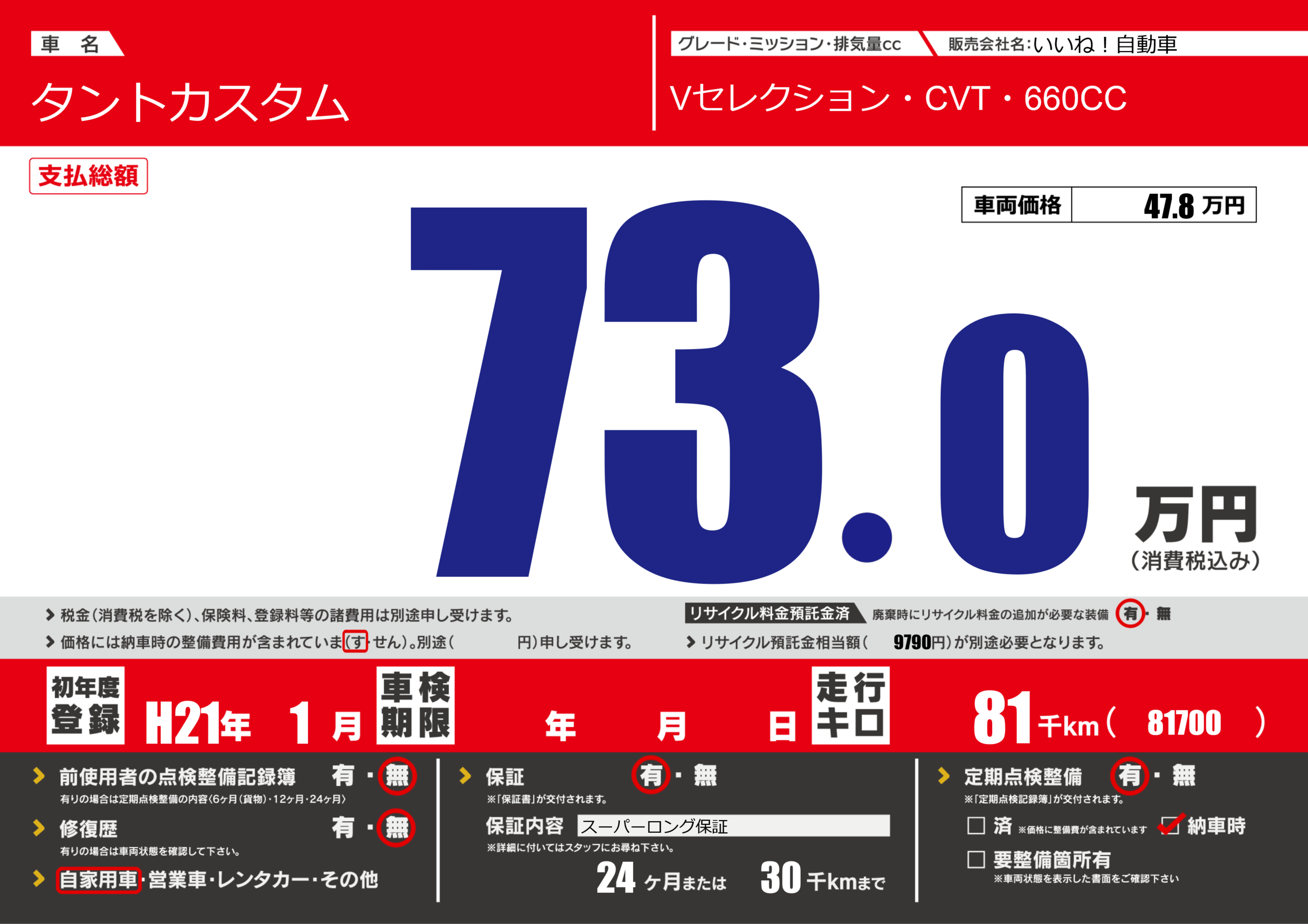 保証付き 保証内容(スーパーロング保証) 24ヶ月または(30)千kmまで |