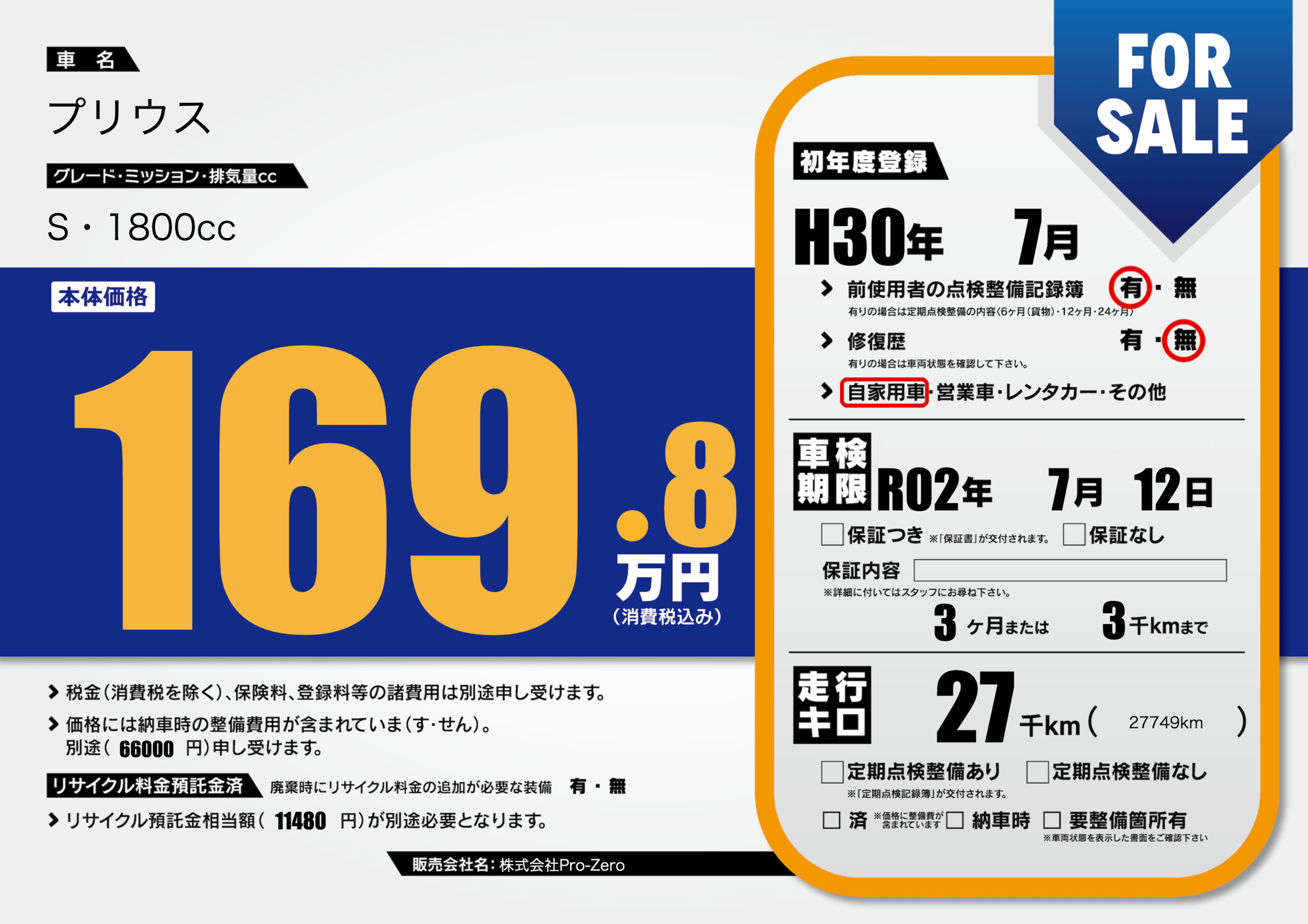 | 走行キロ | 2.7万km | 初年度登録 | H30年7月 |