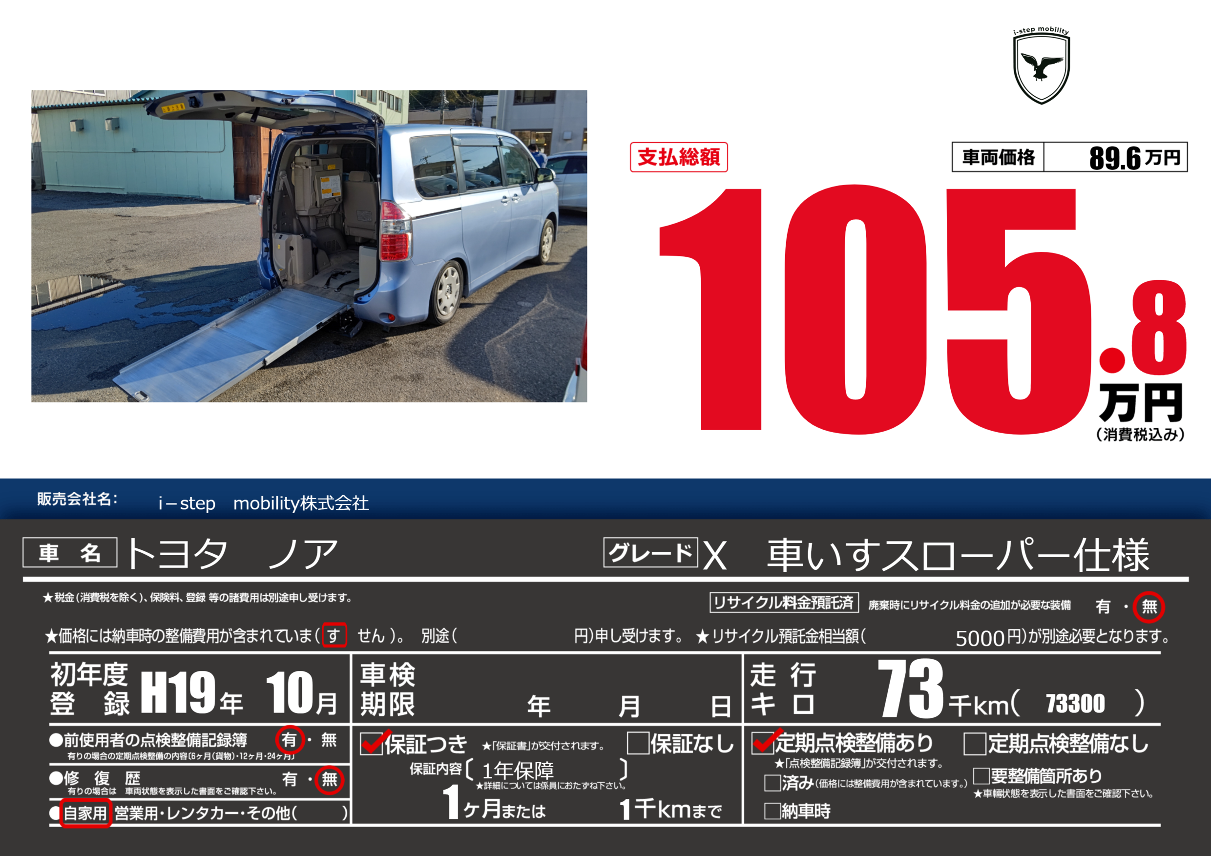| 走行キロ | 7.3万km | 初年度登録 | H19年10月 |