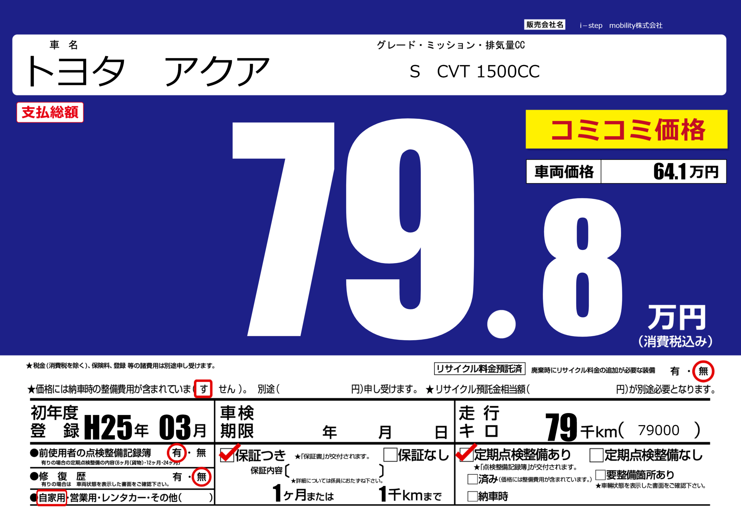 | 車名 | トヨタ アクア | グレード ミッション 排気量 |
