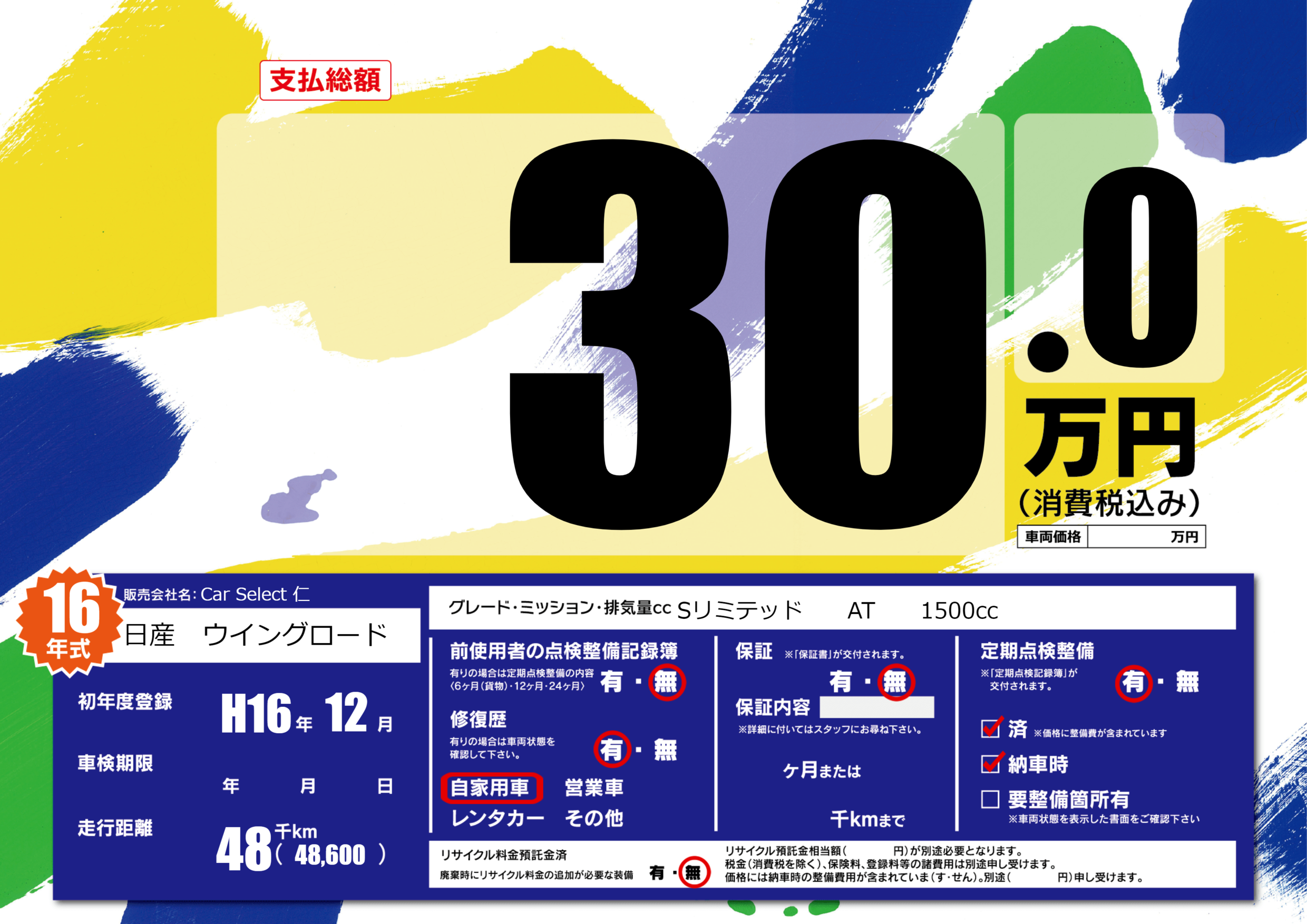 | 車名 | 日産 ウイングロード(売約済) | グレード ミッション 排気量 |