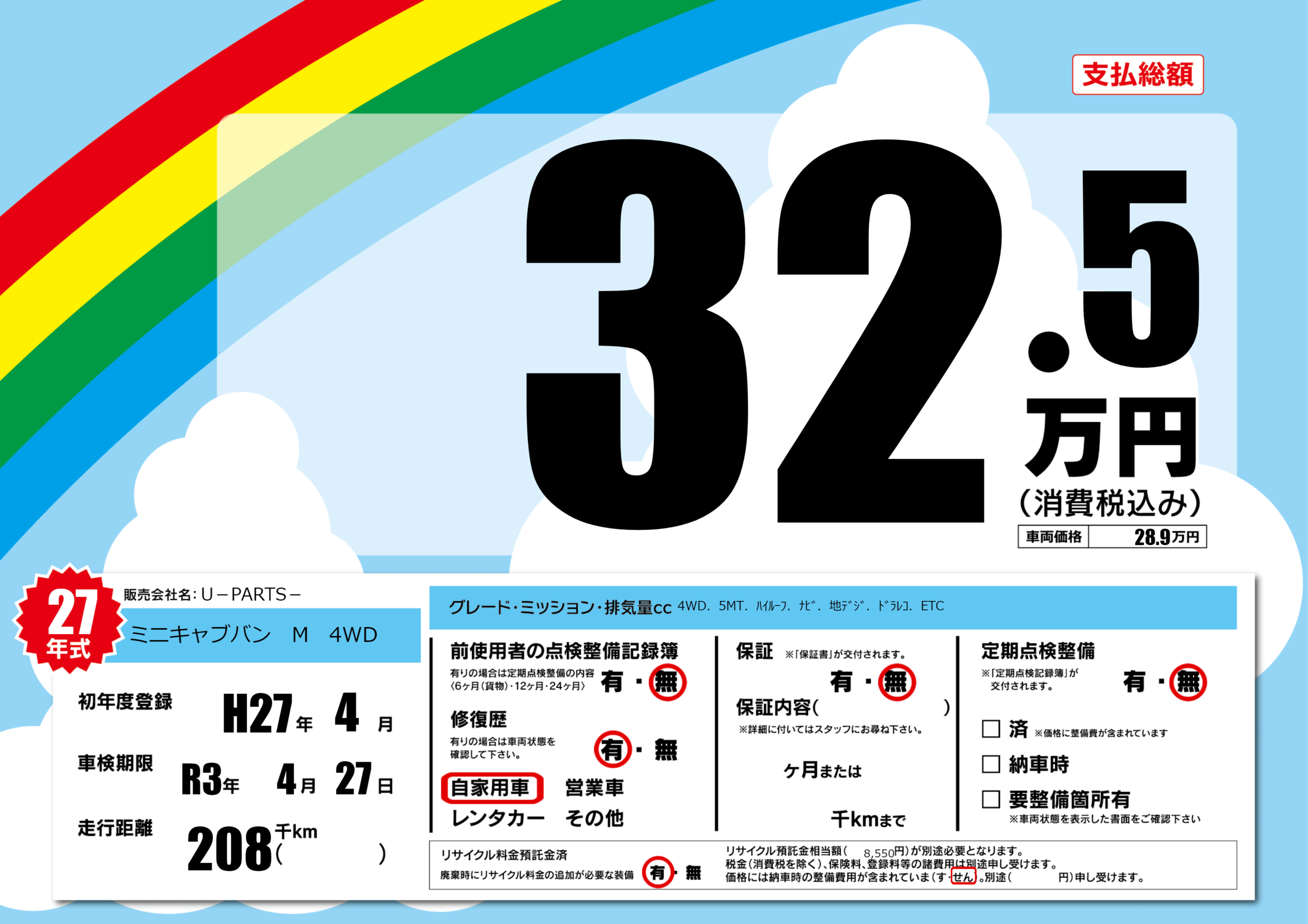 | 走行キロ | 20.8万km | 初年度登録 | H27年4月 |