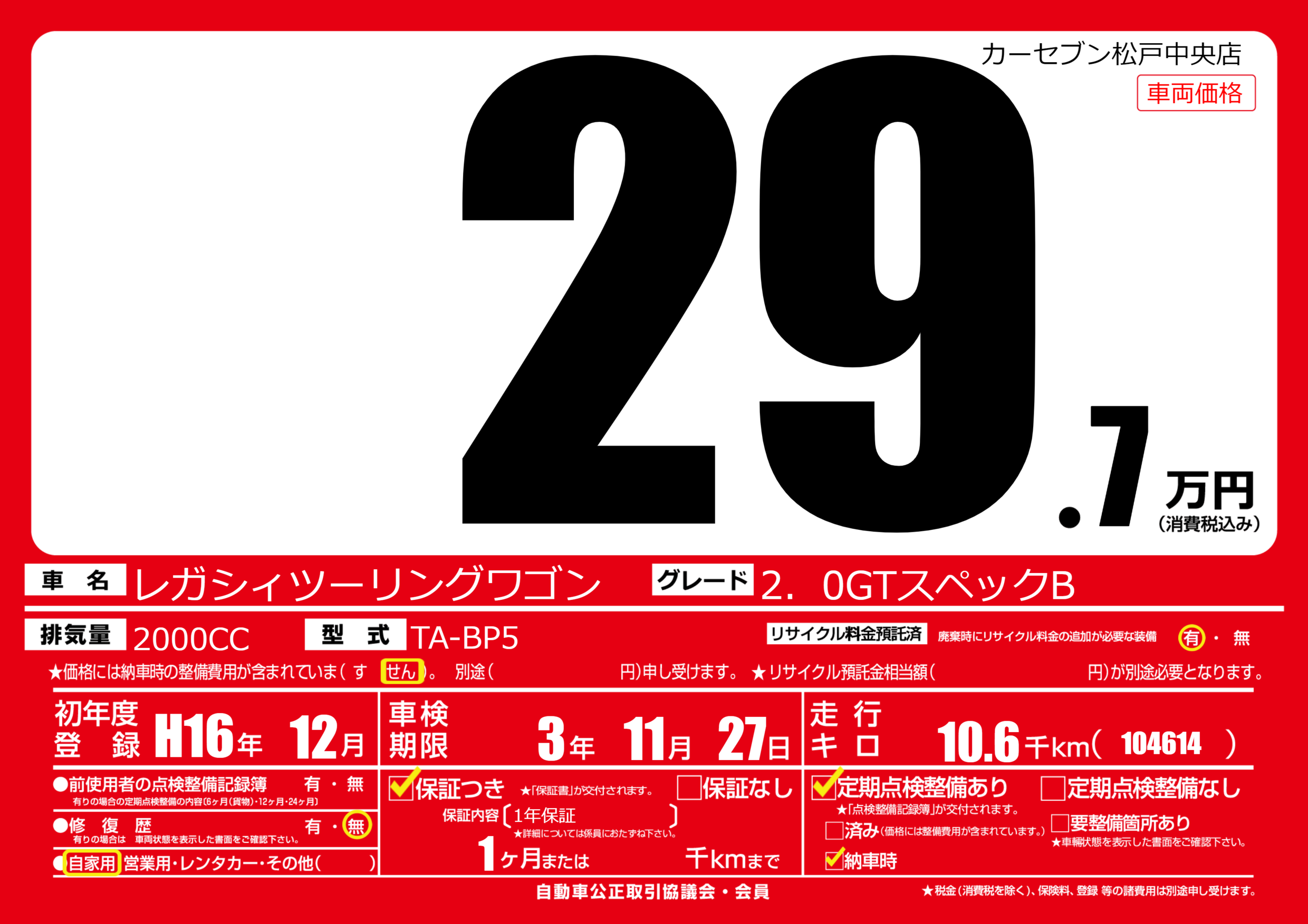 | 車名 | レガシィツーリングワゴン | グレード ミッション 排気量 |
