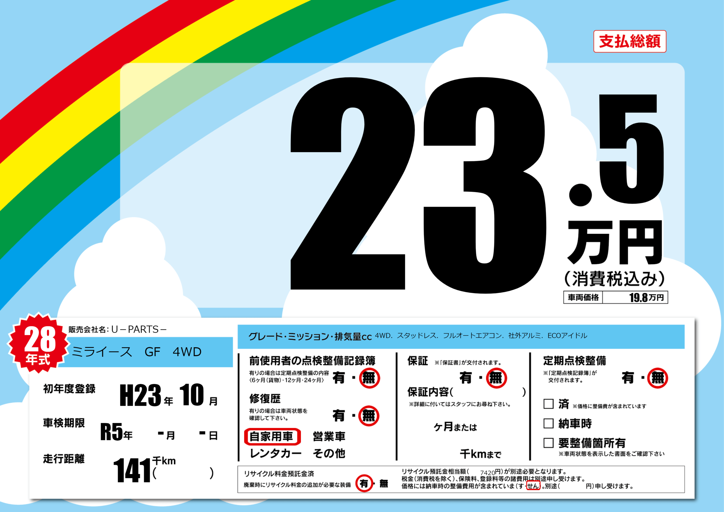 | 走行キロ | 14.1万km | 初年度登録 | H23年10月 |
