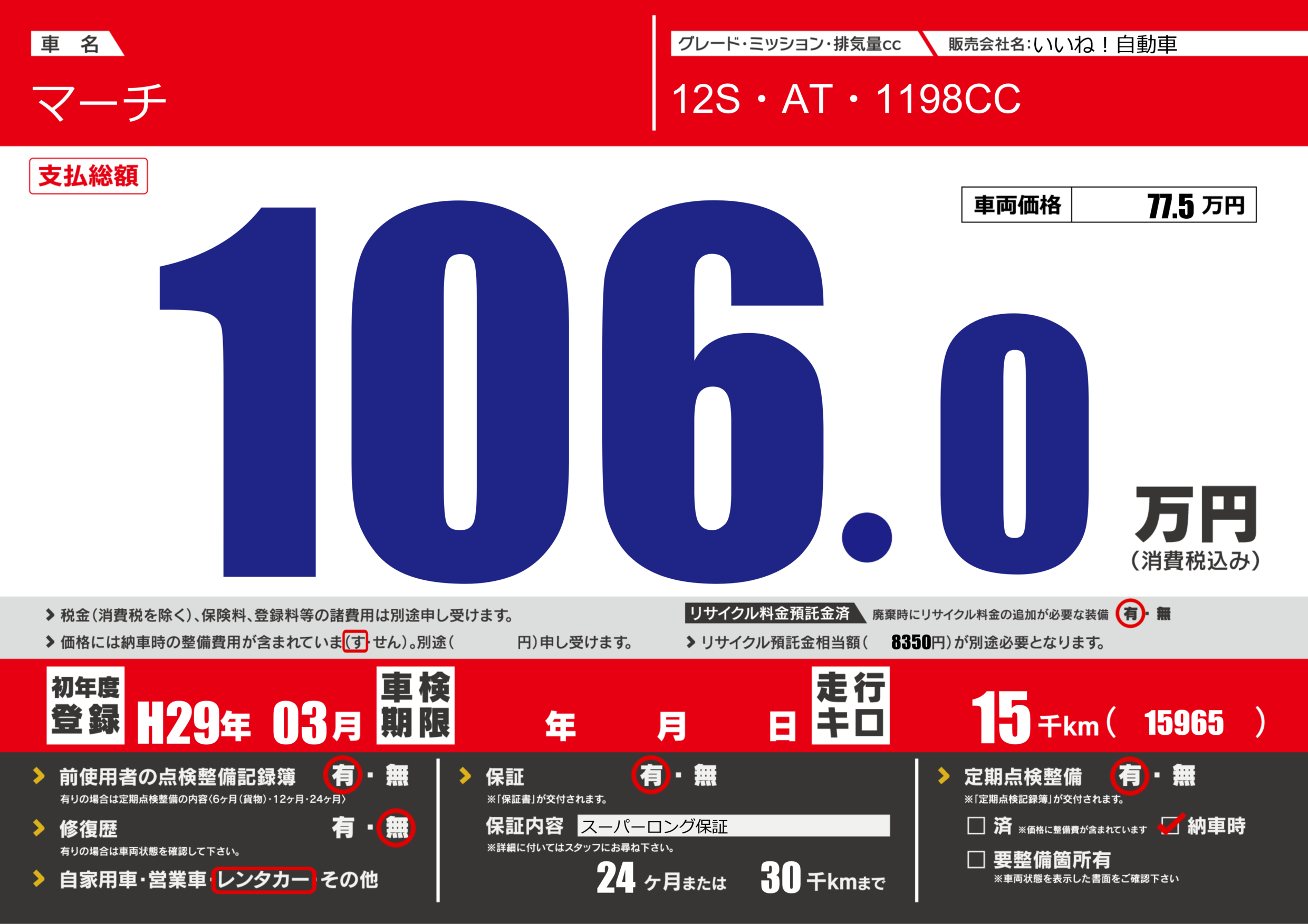 保証付き 保証内容(スーパーロング保証) 24ヶ月または(30)千kmまで |