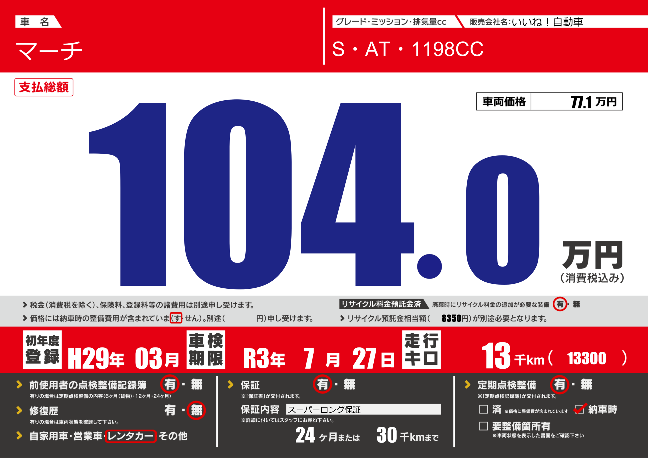 保証付き 保証内容(スーパーロング保証) 24ヶ月または(30)千kmまで |
