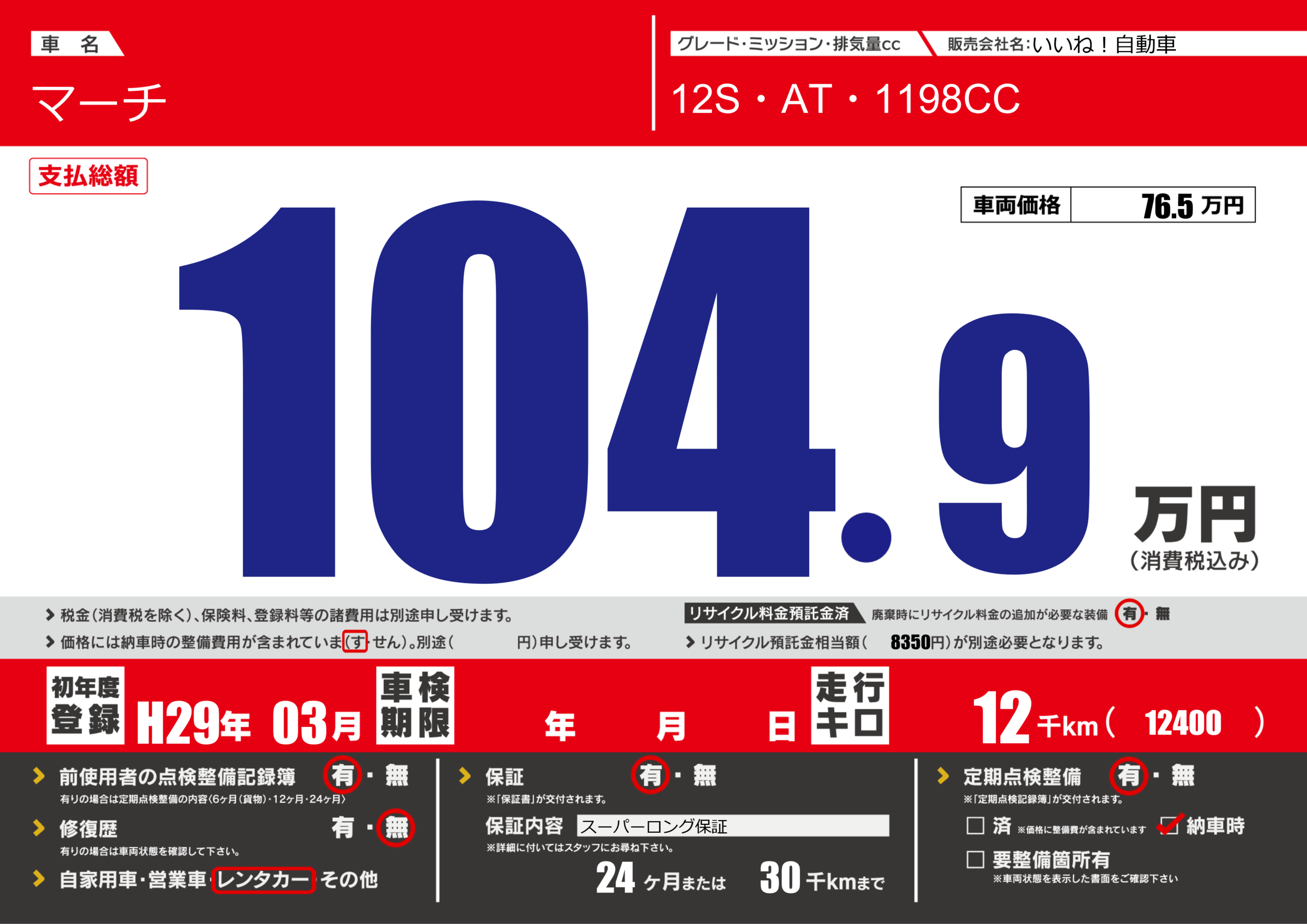 保証付き 保証内容(スーパーロング保証) 24ヶ月または(30)千kmまで |