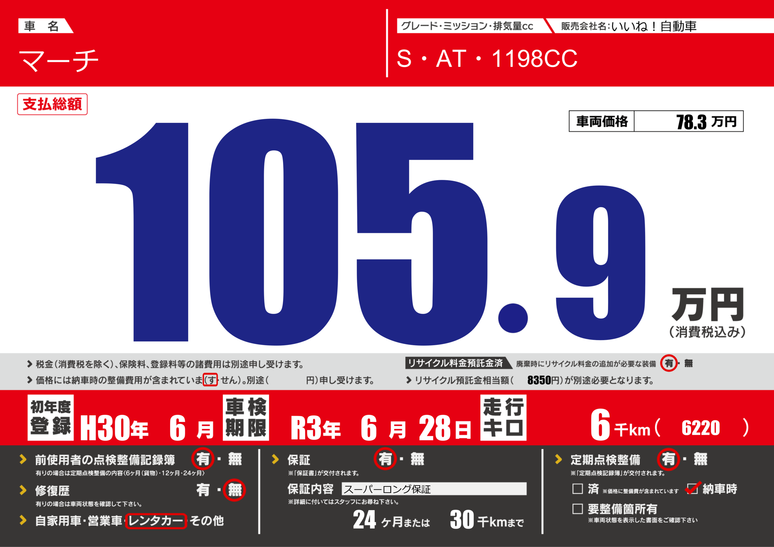 保証付き 保証内容(スーパーロング保証) 24ヶ月または(30)千kmまで |